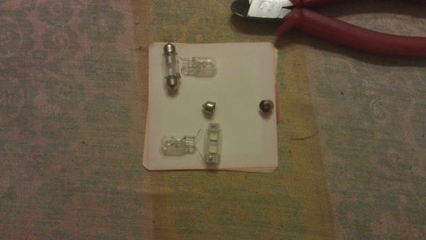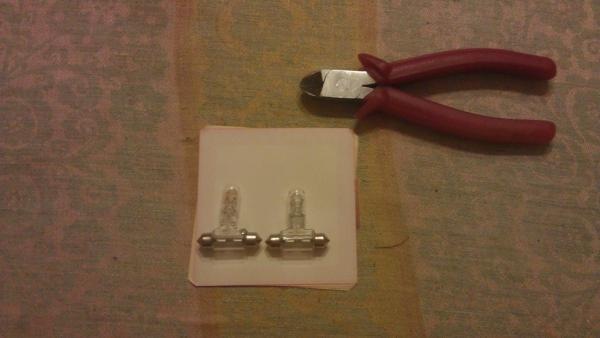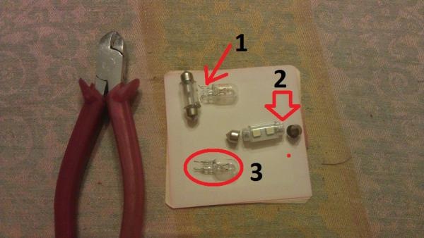 3. Лампочка W5W с откусанными возле цоколя лампы контактами (откусывал естественно там где контакт заведён в цоколь лампы и заканчивается — на этот момент стоит обратить внимание при покупке самой лампы, поскольку такие контакты могут "смотреть" как вовнутрь, так и внешне, что более удобно для откусывания кусачками)