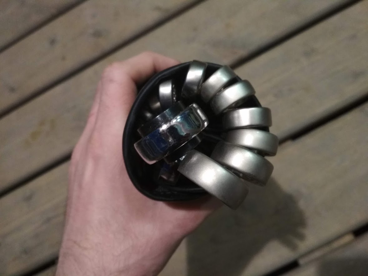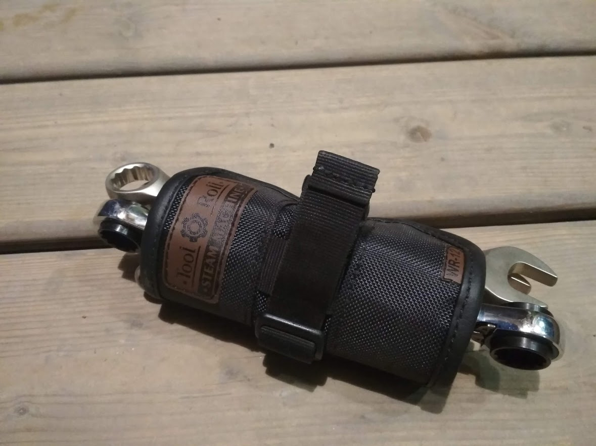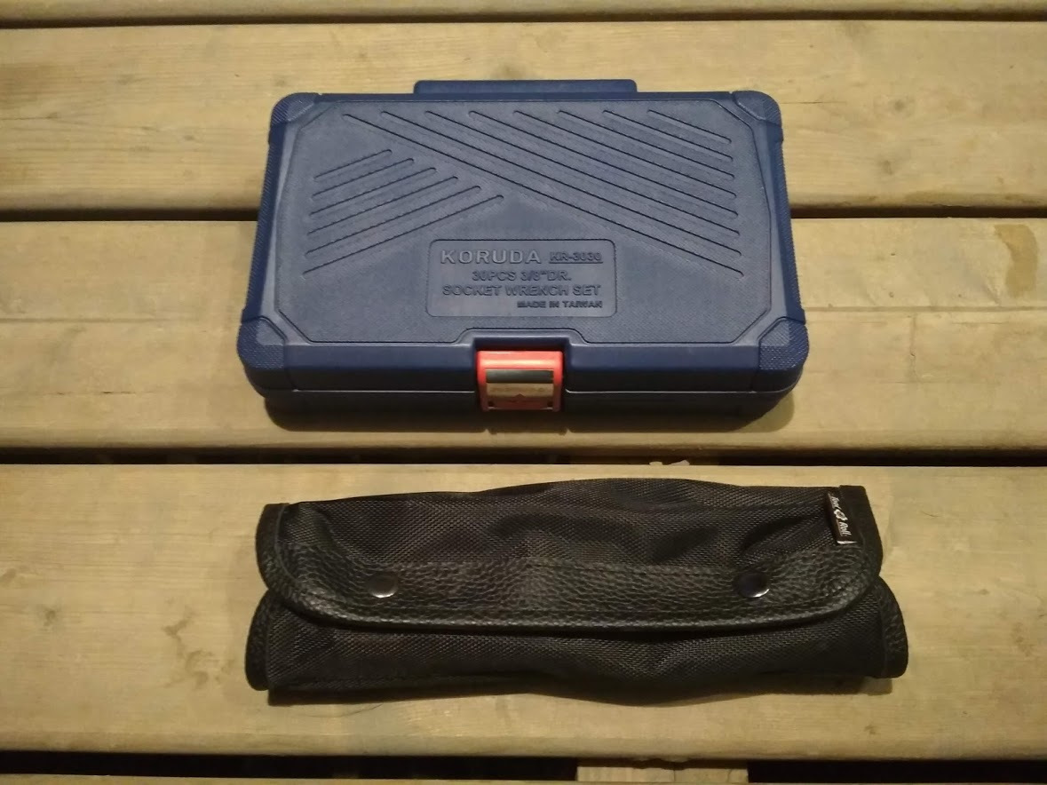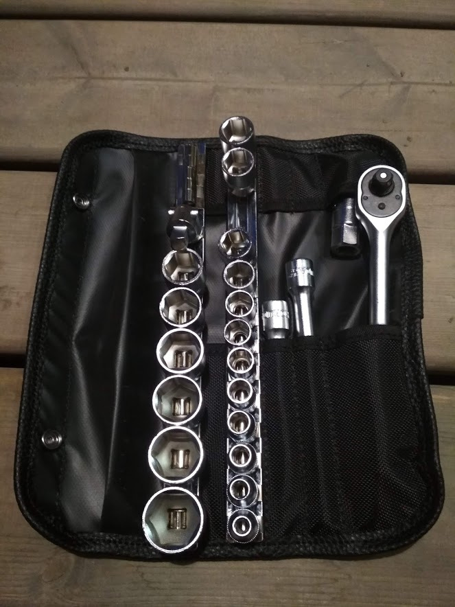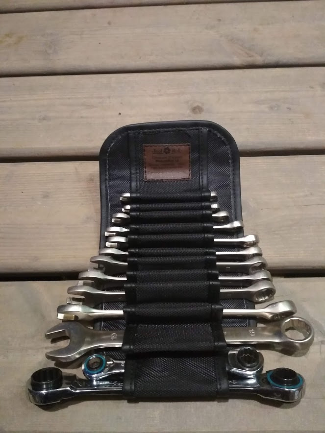 За кадром осталась большая сумка-скрутка, она живет у меня давно и в ней прописаны вообще все подряд инструменты. В том числе до недавнего времени основной 1/2 набор головок. Но они лежали в кармане россыпью, что крайне неудобно при использовании. Сама сумка заполнена не больше чем на 1/2, инструменты постоянно кочуют из кармана в карман. Словом у меня там бардак, показывать стыдно, и я пока её не понял до конца)