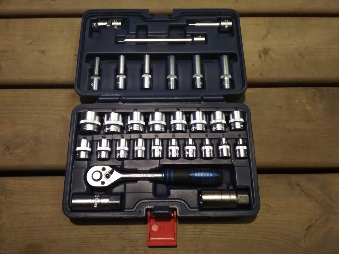 Снова повторяю — кто ищет, тот найдёт. С Кобальтом не сложилось, цена кусается, зато в моём любимом магазине нашелся набор Koruda KR3030 за 2150. По составу он отличается от Кобальта отсутствием самого короткого удлинителя и штуки превращающей удлинители в вороток. Зато присутствовал небольшой сет высоких головок.