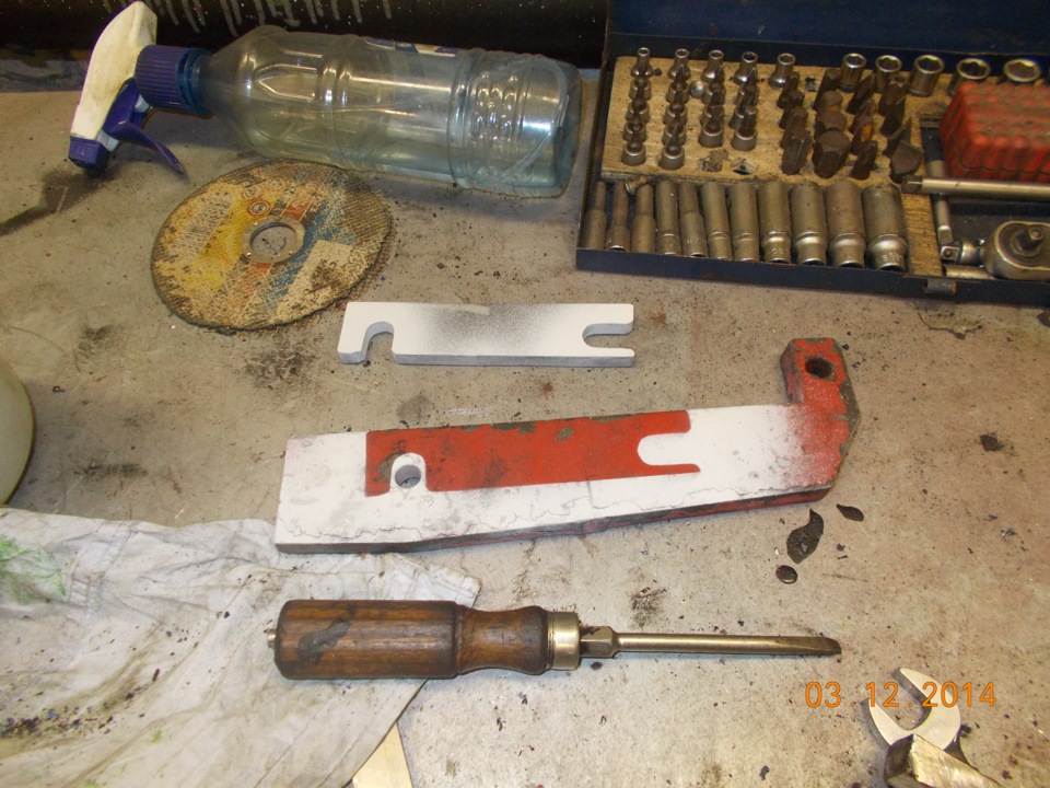 Для того чтобы при запресовке рычаг не деформировался, изготовил самодельную распорку.