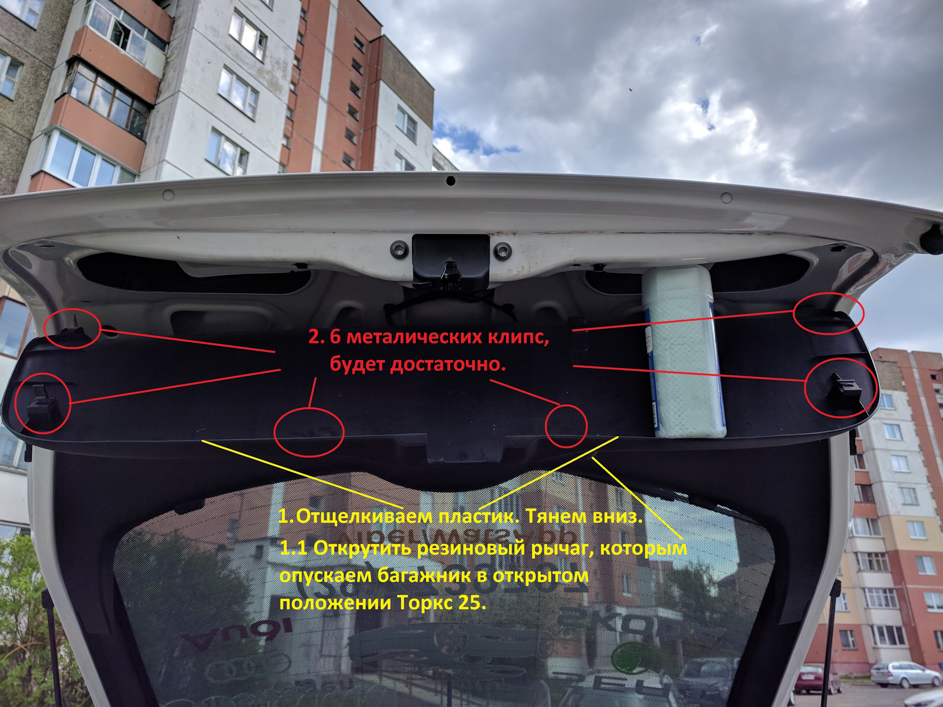 Далее: Откручиваем рычажок которым мы опускаем дверь багажника. Затем пальцами отщелкиваем пластиковую защиту, 6 защелок будет достаточно для работы с замком.