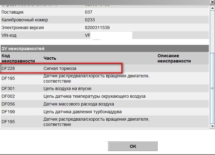 Ошибка DF228 как правило предупреждает нас о неисправности концевого выключателя педали тормоза. Одновременно с этим перестаёт работать круиз контроль — зелёненькая пиктограмма круиза на приборке загорается, а циферки нет. В тоже время, если поддеть педаль ногой и приподнять вверх, то циферки загорятся но контроль скорости всё равно не включится.