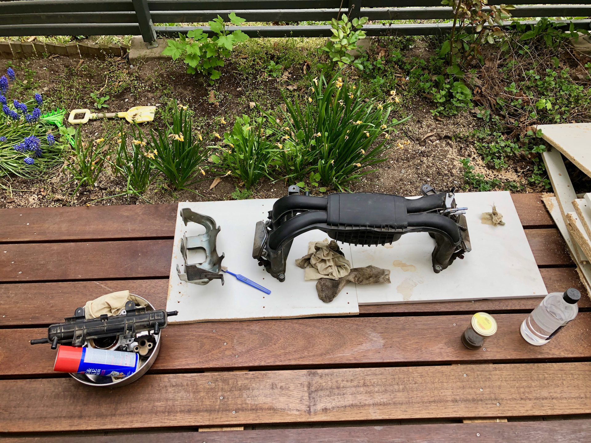Но я решил пережить первую зиму, посмотреть как будет себя машина вести. Кроме того времени на ремонт не было. Кроме того, я купил измеритель разряжения, измерил разряжение и он было в норме, поэтому решил отложить на потом. Вот потом наступило 1го мая, точнее 30го апреля. Пришел я с работы домой пораньше и решил, что вроде как погода шепчет: "Займи и выпей", а на самом деле: "собирайся и разбирай все к чертям". Учебник напечатан, инструмент в ящик положен, машина под окном. Пошел разирать. На все про все ушло ровно 2 часа с моей педантичностью. Разбирать не торопился, потмоу что некуда.