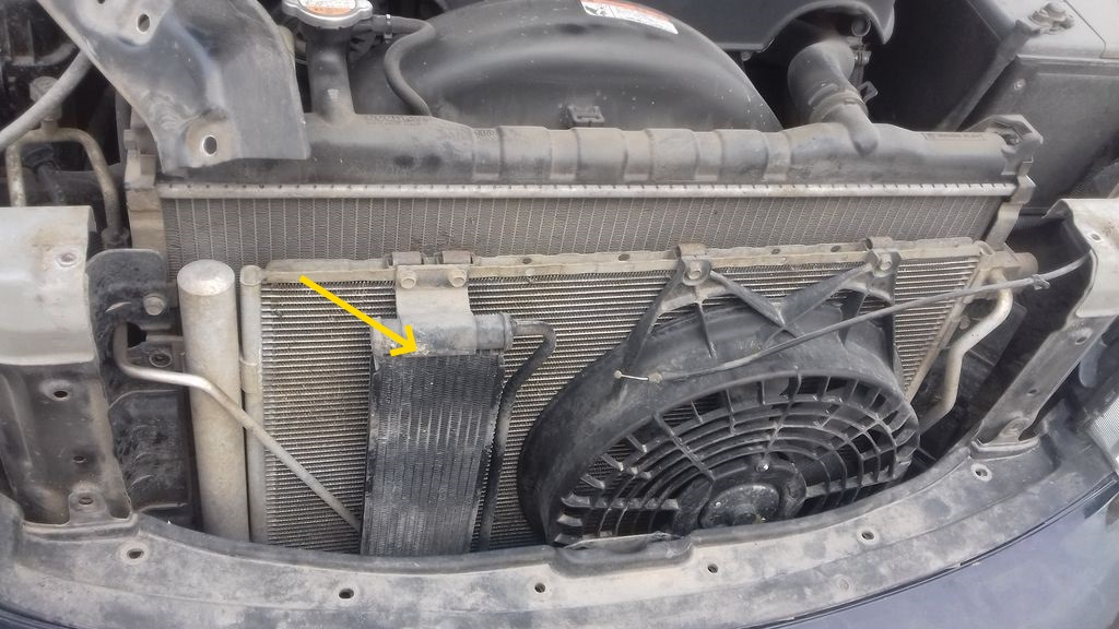 4. Откручиваем масляный радиатор и оставляем висеть на шлангах. Вентилятор отсоединяем от проводки и можно не откручивать, а винуть вместе с радиатором.