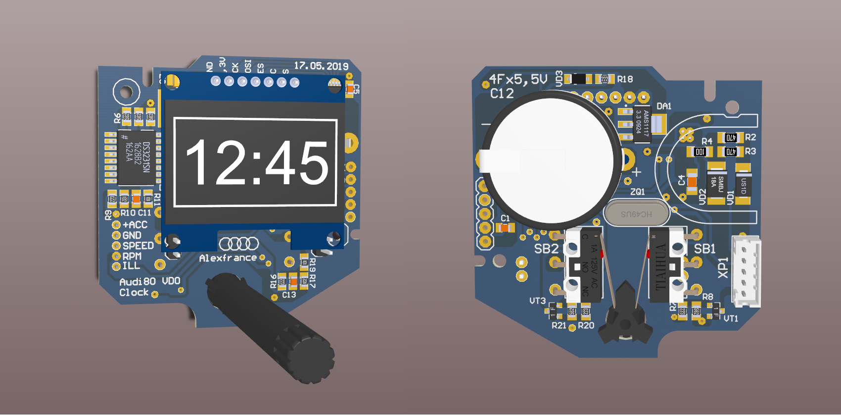 Работы по улучшению приборной панели не стоят на месте) Сегодня закончил разработку модуля часов на OLED графическом дисплее. Вкратце опишу, про этот модуль как альтернативе старым "потекшим" часам и кучей полезных функций. Платку разрабатывал под размеры оригинальных часов, чтобы тупо вынуть старые и вставить новые. По мимо часов в этом модуле будет отображаться различная информация. Вообще эти часы можно воспринимать как мини БК, дополняющий основной.