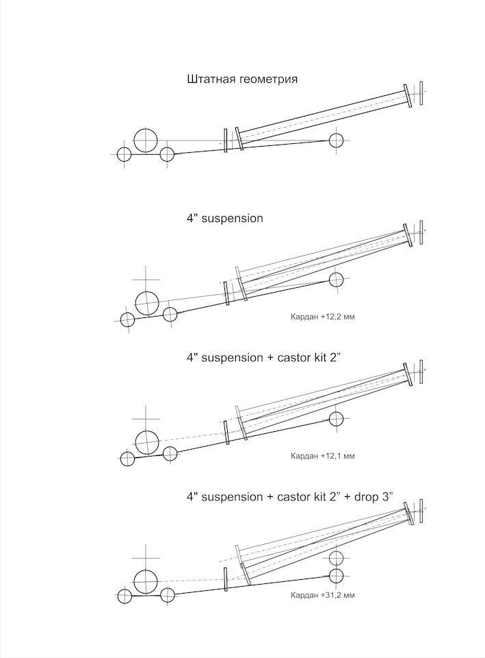 Я и для +4" строил картинку исключительно из-за этого вопроса. Причём длина кардана и координаты переднего выхода раздатки брал из натурных замеров с допуском +-5/10%. Для +2" не строил.