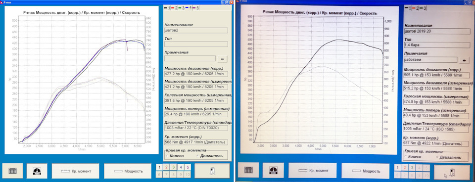 Итак, для начала сняли прошлогоднюю характеристику на пружинном бусте 0,9. Затем, после 14-ти замеров подняли буст и выяснили, что старенький АЕМ-320 уже не справляется с работой и просаживается. В тот же вечер нашли на сайте Clubturbo Вальбро 420, а пока на время взяли точно такой же у запасливого Айвара Мустакимова. На следующий день едем опять на стенд и снимаем заветные 500+, а если быть более точным, 515 л.с. и почти 70кГ момента! Графики позапрошлогодних замеров и нынешних можете сравнить: