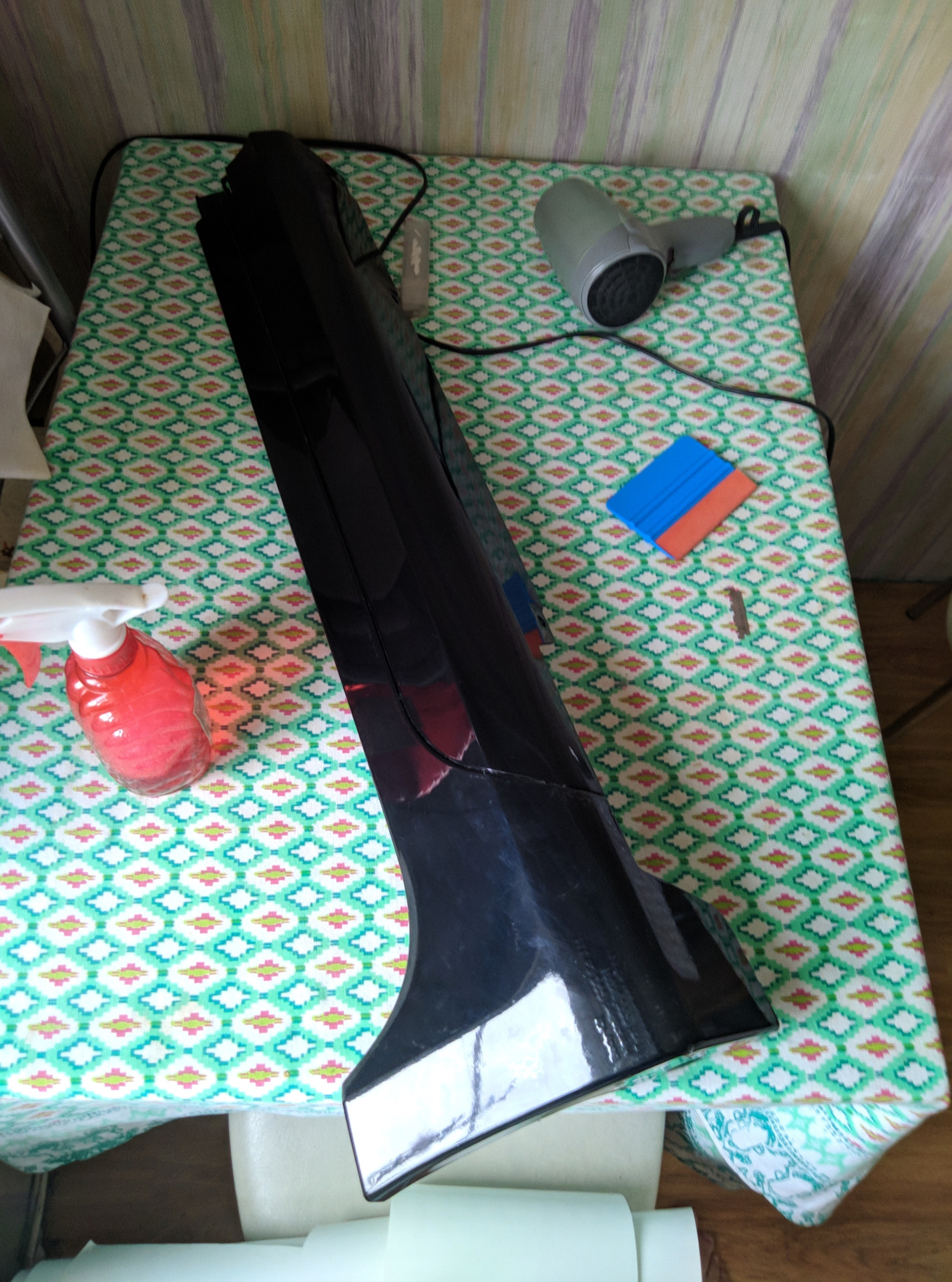 Пленку покупал еще на накладки порогов, остался кусочек и его хватило на обе задние половинки порогов. Форма задней половинки порога впринципе не сложная, с первым пришлось немного повозиться, второй уже сделал гораздо быстрее. Надо купить еще пленку и продолжать обклеивать, передний обвес хочу полностью весь обклеить, пороги тоже полностью, а вот по заднему еще не решил.