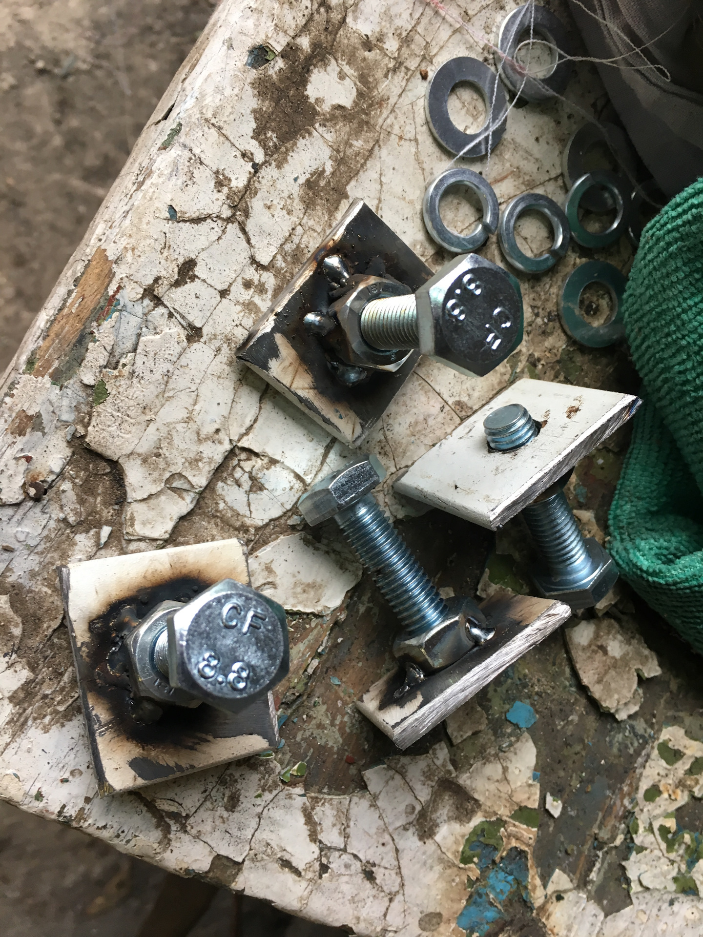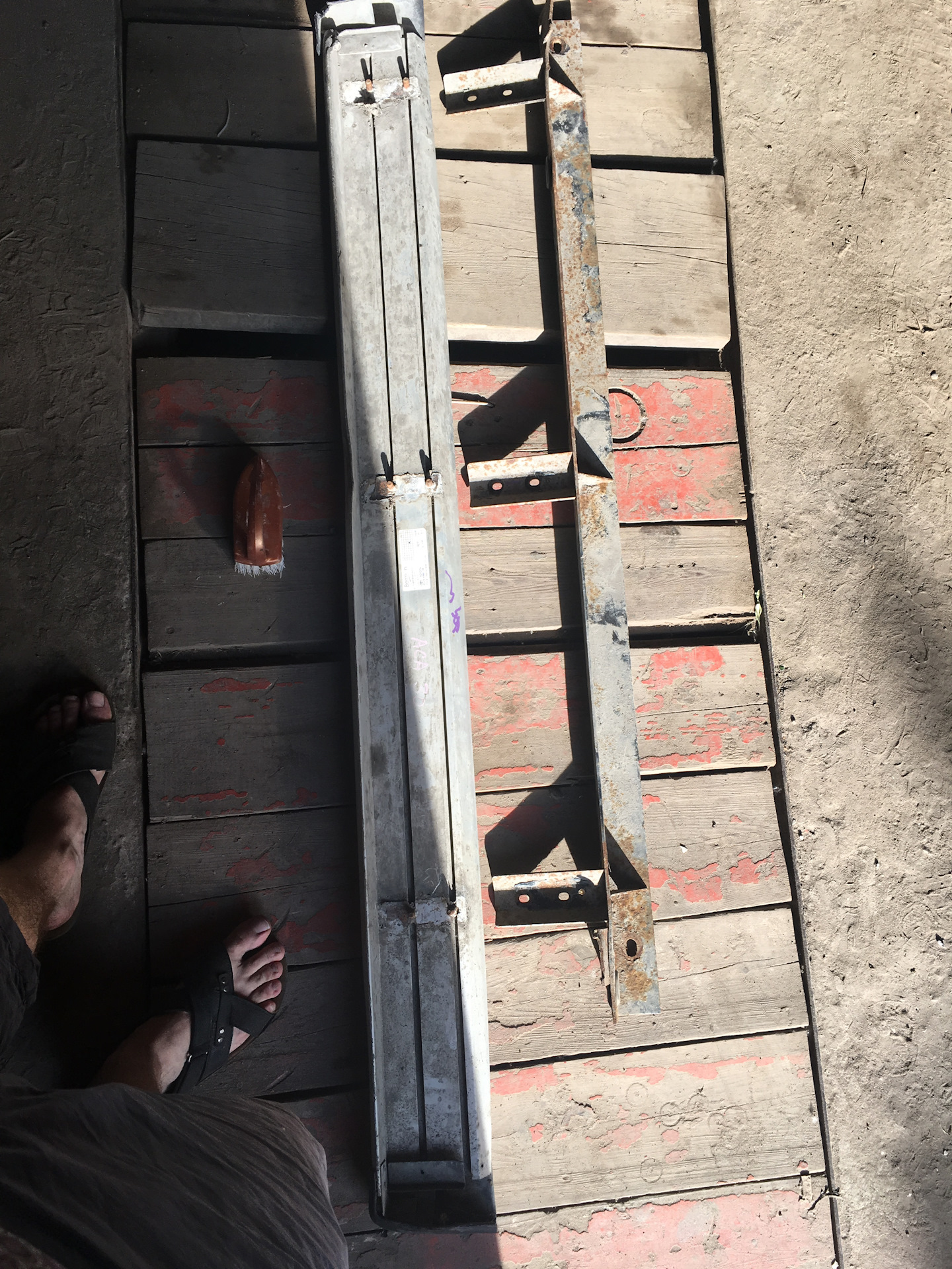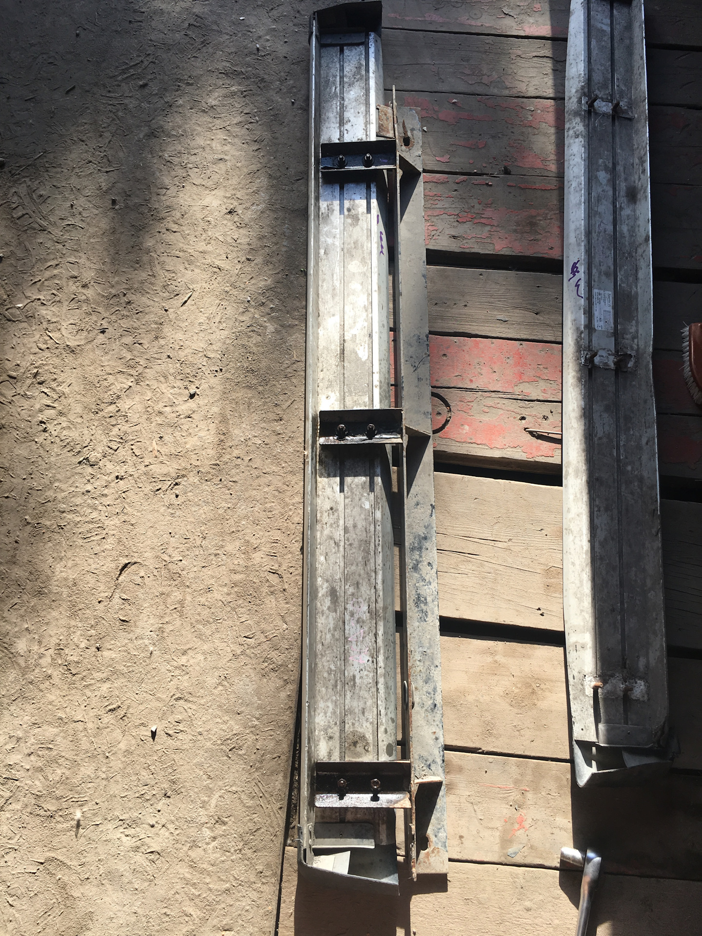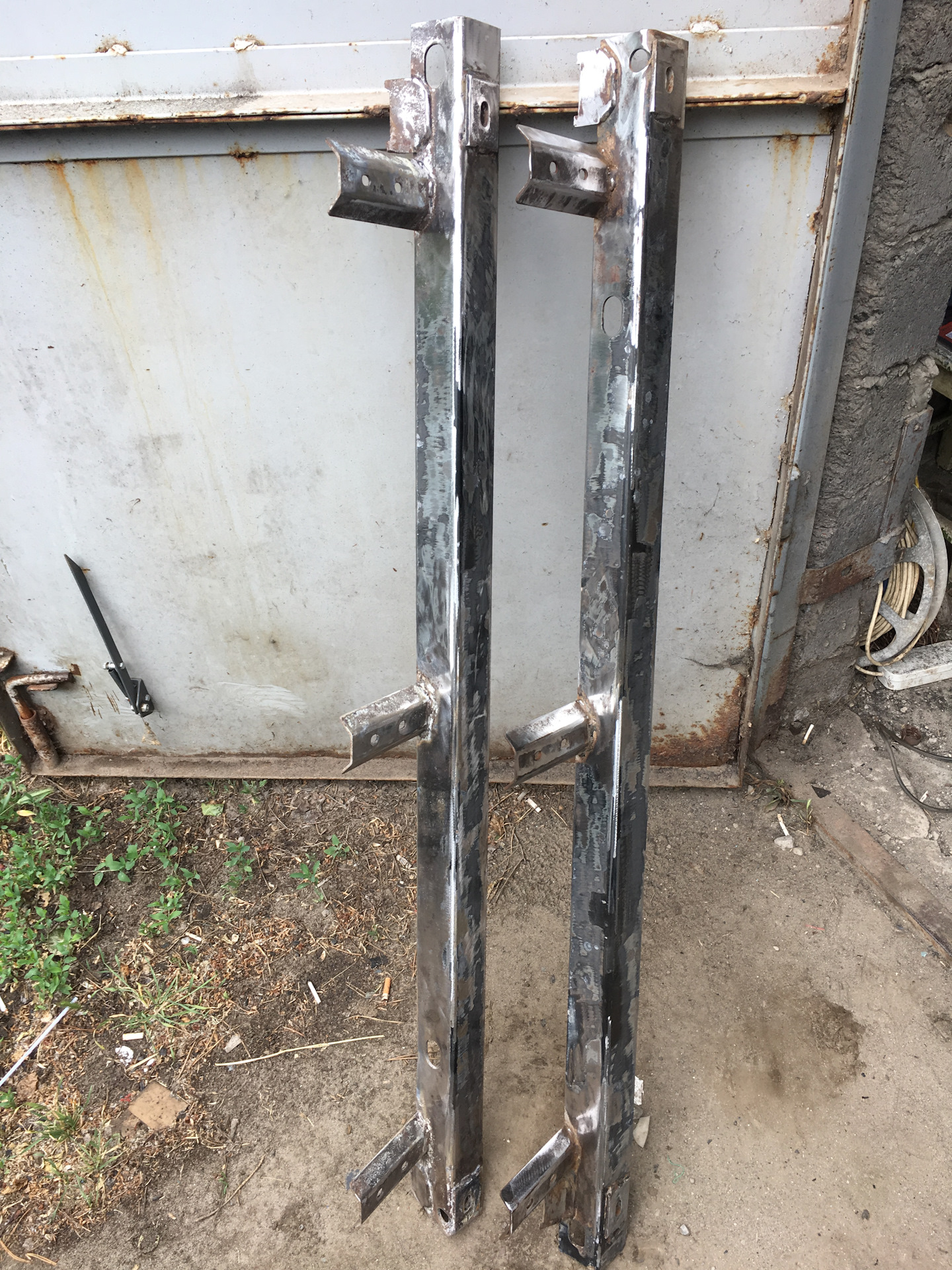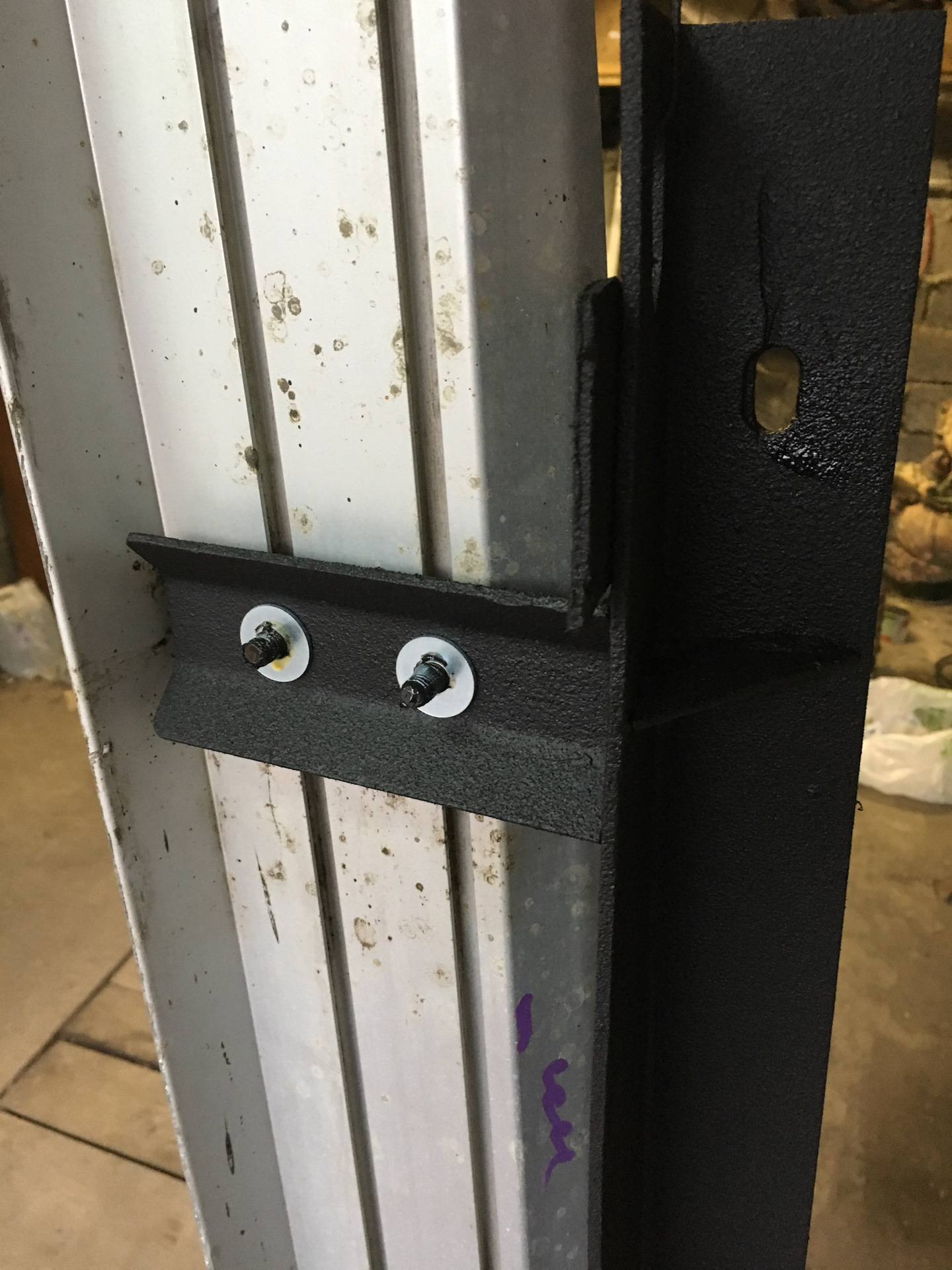 Закладных с порогами не было. Купил два уголка в леруа толщиной около 4мм, увеличил отверстия, отрезал, получились закладные.