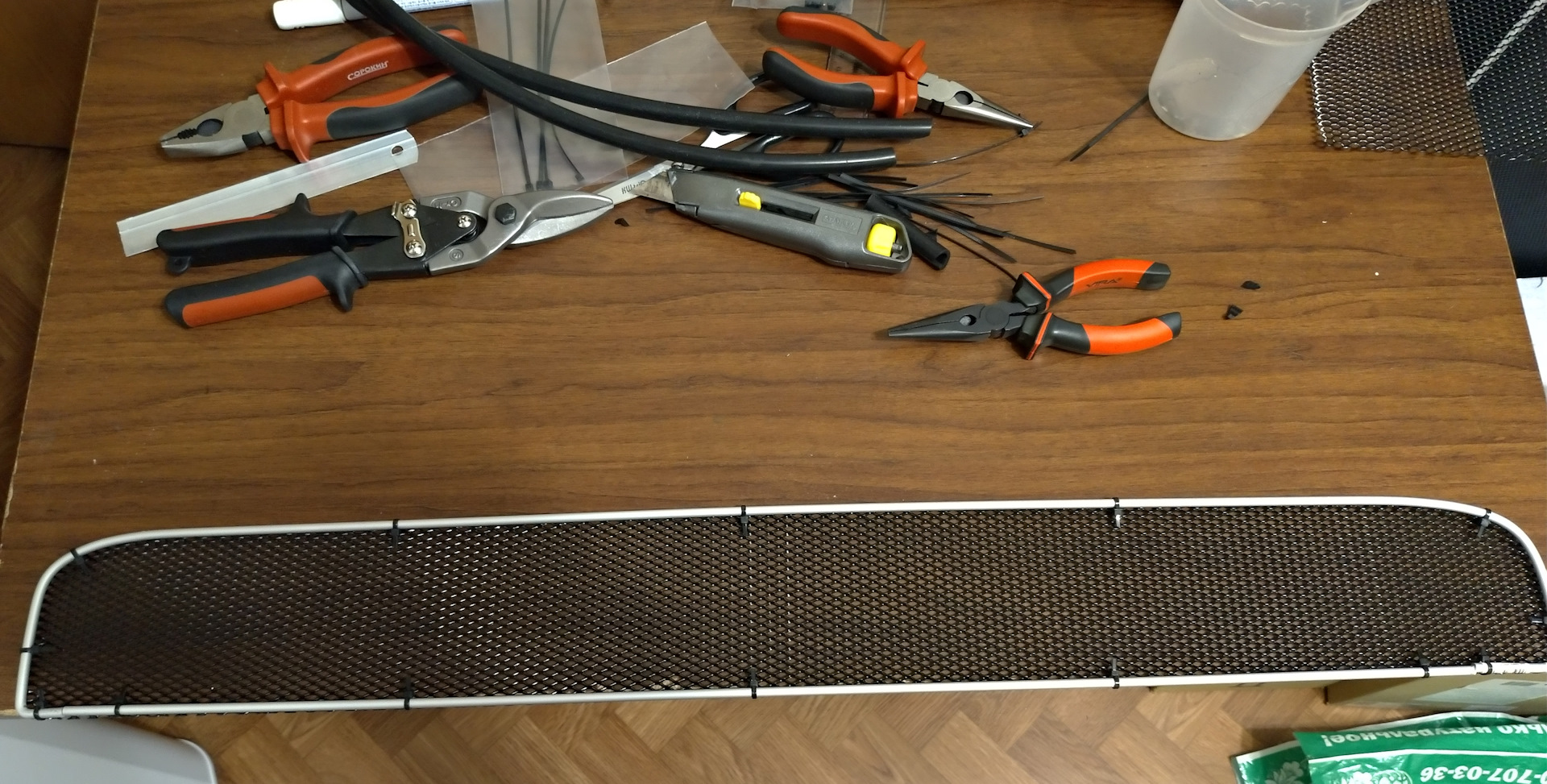 Из картона вырезал примерную форму в размер – получился макет (прямоугольник 80см Х 10 см со срезанными верхними углами). По форме макета согнул алюминиевый пруток, спаял контур. Далее отрезал две алюминиевые полоски по высоте контура 10 см и приварил в места предполагаемого крепления к бамперу. Стяжками закрепил сетку на полученную конструкцию и обрезал вровень. По контуру обтянул силиконовым шлангом, чтоб края не царапали ничего, в котором заранее сделал прорезь вдоль, чтоб получился профиль. В места крепления в бампере вставил скобки, высверлил отверстия под болт. Далее высверлил отверстия в полосках, которые приваривал для крепления. Ну и установил получившуюся защиту на место. Результатом доволен на все сто)