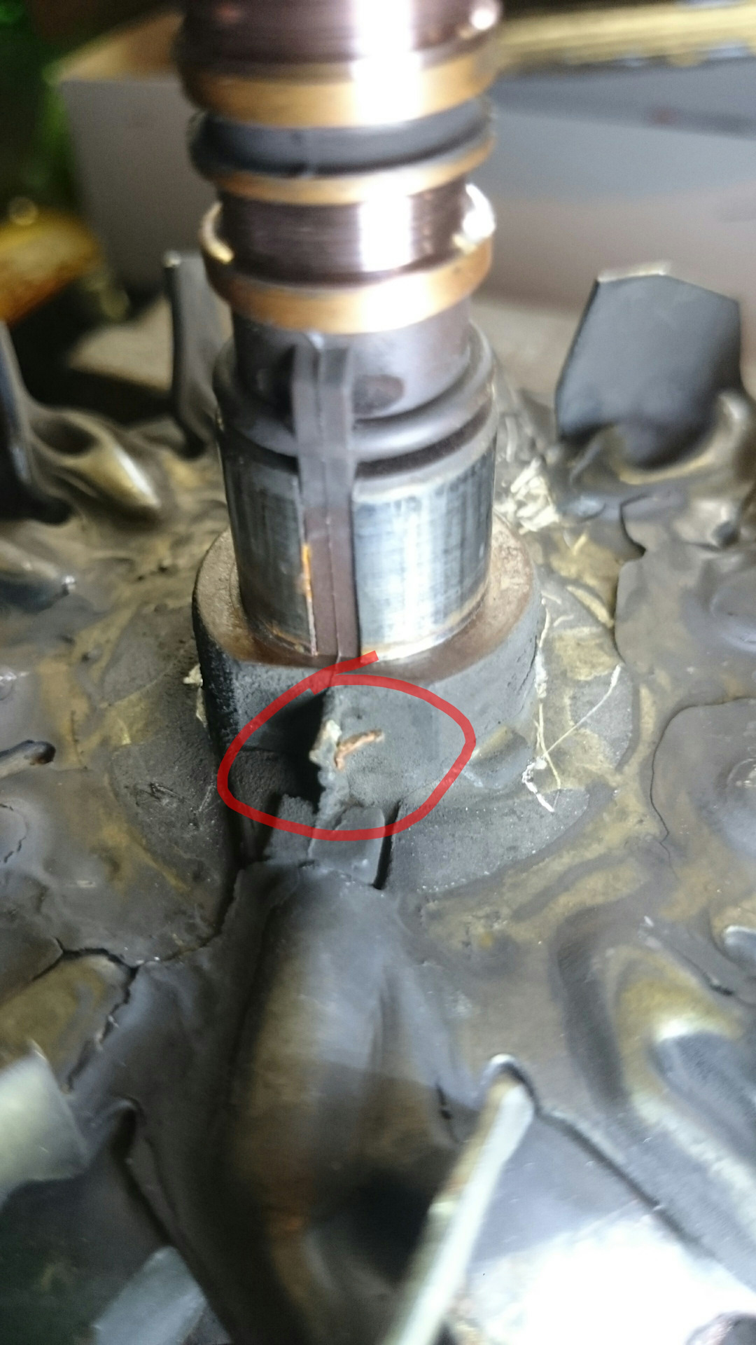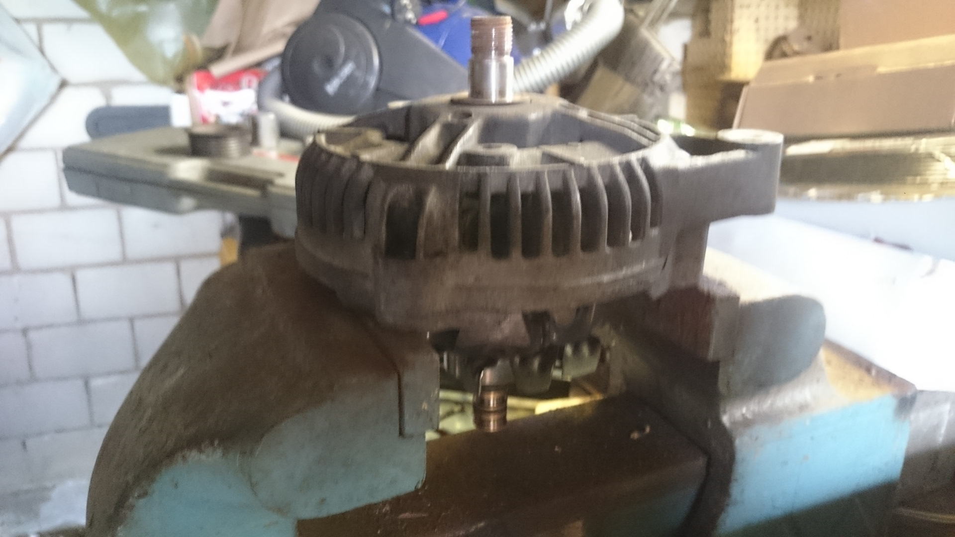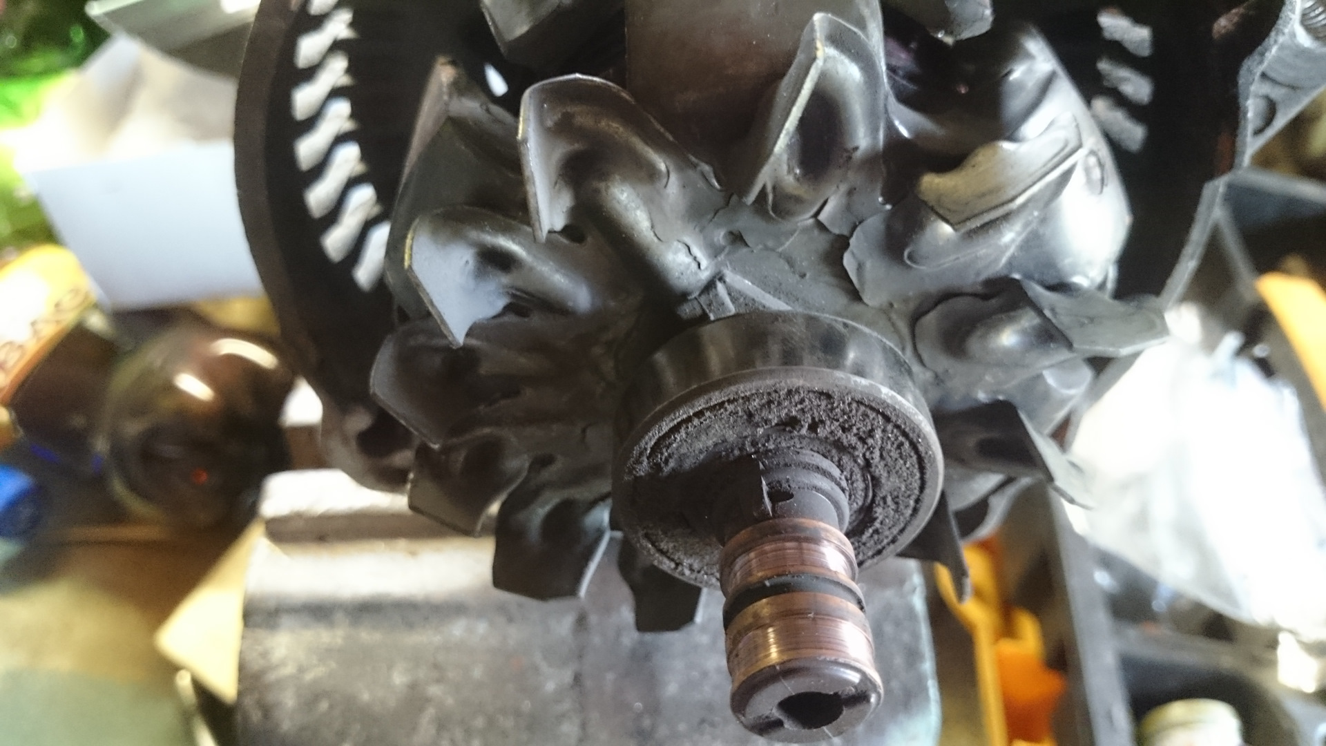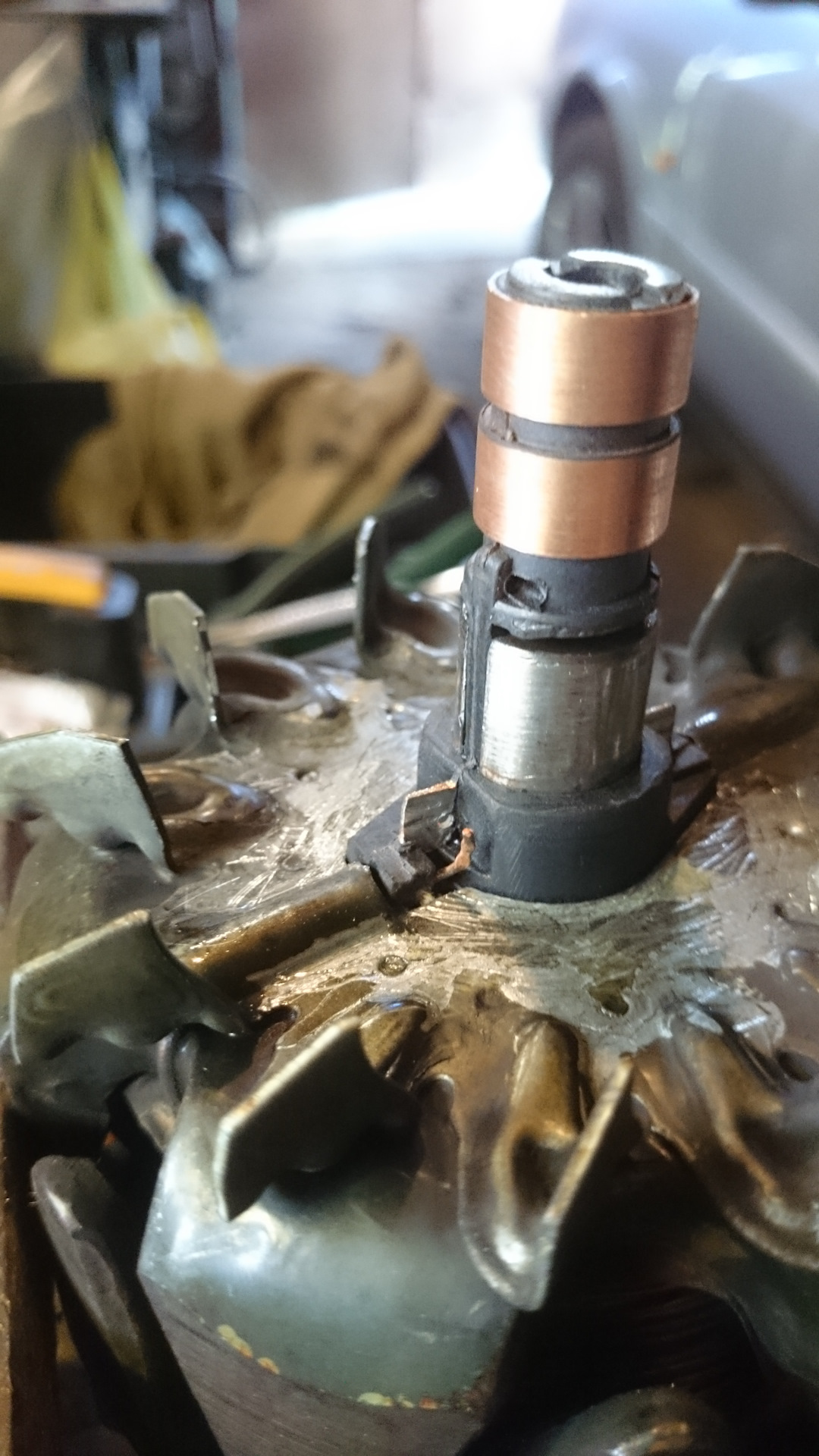 В прошлый раз, месяца 3 назад, когда менял щётки обратил внимание, что подизносился коллектор(кольца). С верху не видно, мешает диодный мост. Выручил телефон. Фото со вспышкой и диагноз готов, надо менять.