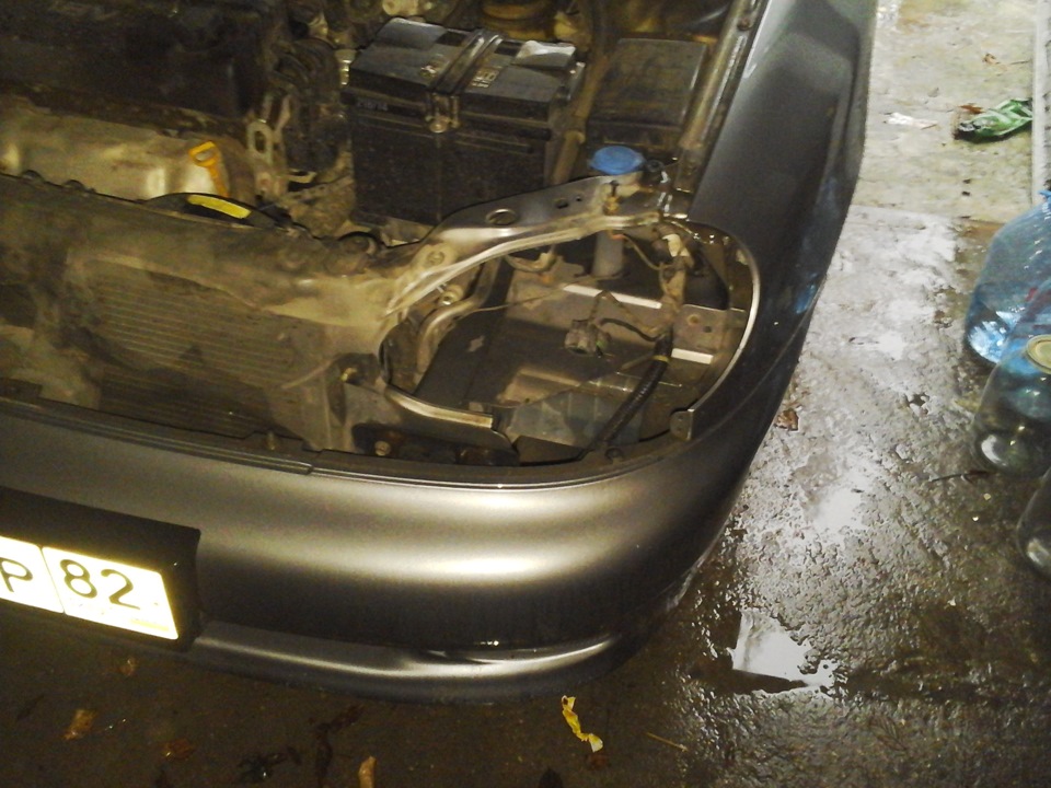 Есть еще самый простой и быстрый способ. Не нужно снимать фару или ехать на яму. Берем головку на 8, засовываем руку под бампер, нащупываем резьбу и на ней гайку. Головкой выкручиваем две гайки. Туго быть не должно, так как гайка прижимает пластиковый бампер. Короче говоря, я рукой снимаю за 2 минуты. Также устанавливаю обратно.