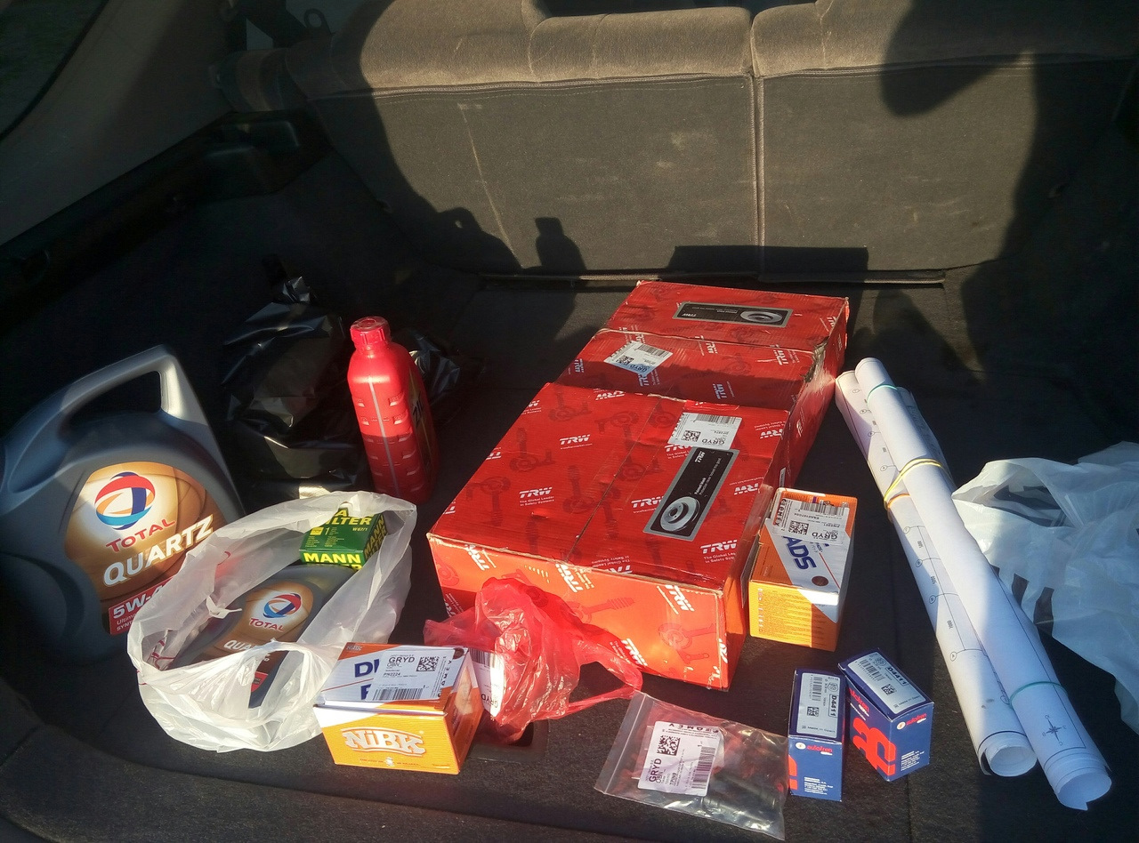 Пришло время технической части. В первую очередь сделали дефектовку тормозов. Они очень жутко скрипели. Под замену были приговорены диски по кругу и нужно было обслужить суппорта и поменять тормозуху. Установлены диски TRW, колодки NIBK. Перебраны задние суппорты с заменой поршней на новые. И заоддно было заменило масло в двигателе Total 5w40. Еще гудел ГУР, старая жидкость была вся черная, зилили ZIc стало в разы меньше гудеть и легче крутиться.