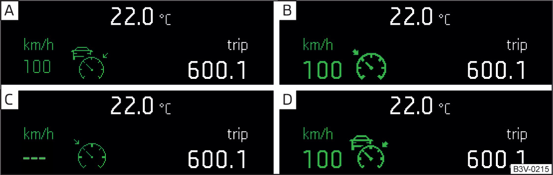 Если при автоматической КП регулирование запускается при скорости ниже 30 км/ч, то в память всё равно заносится скорость 30 км/ч. Скорость автоматически возрастает до 30 км/ч или до значения, учитывающего скорость движущегося вперёд транспортного средства.