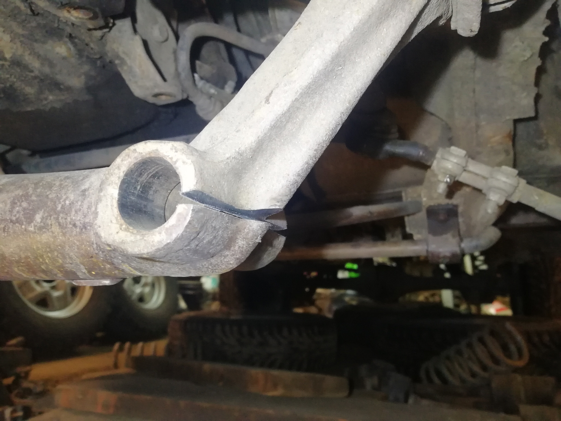 За годы эксплуатации втулки разбило и оси рычагов стали болтаться в них. Надо менять. По уму надо снимать балку, греть, выдавливать мощным прессом, потом так же обратно запрссовывать…но это не для нас. Решено сделать надрез, и выбить их кувалдой. Новые так же поместил на место кувалдой, но с смещением вперёд на 1.5см. Надрез заварил сплотив в одно целое балку и втулку… Это её последний ремонт, но… На мой век хватит) В качестве усилителей использовал стопорные кольца от полуосей классики, спасибо за идею trent63. Нагреваем и насаживаем на втулку, идёт ооооочень плотно. Так же все потом прошёл сваркой.