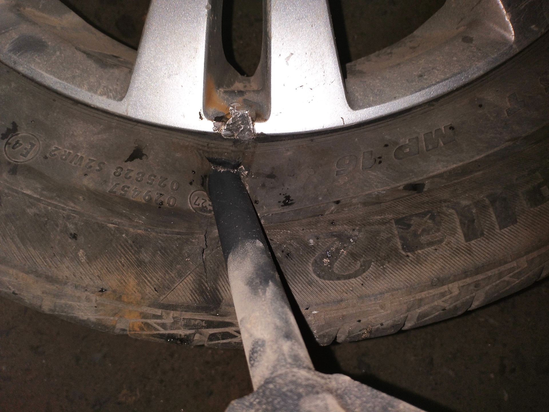 Итого: передней диск покоцан, задний возможно расколот. Задняя правая покрышка на помойку.