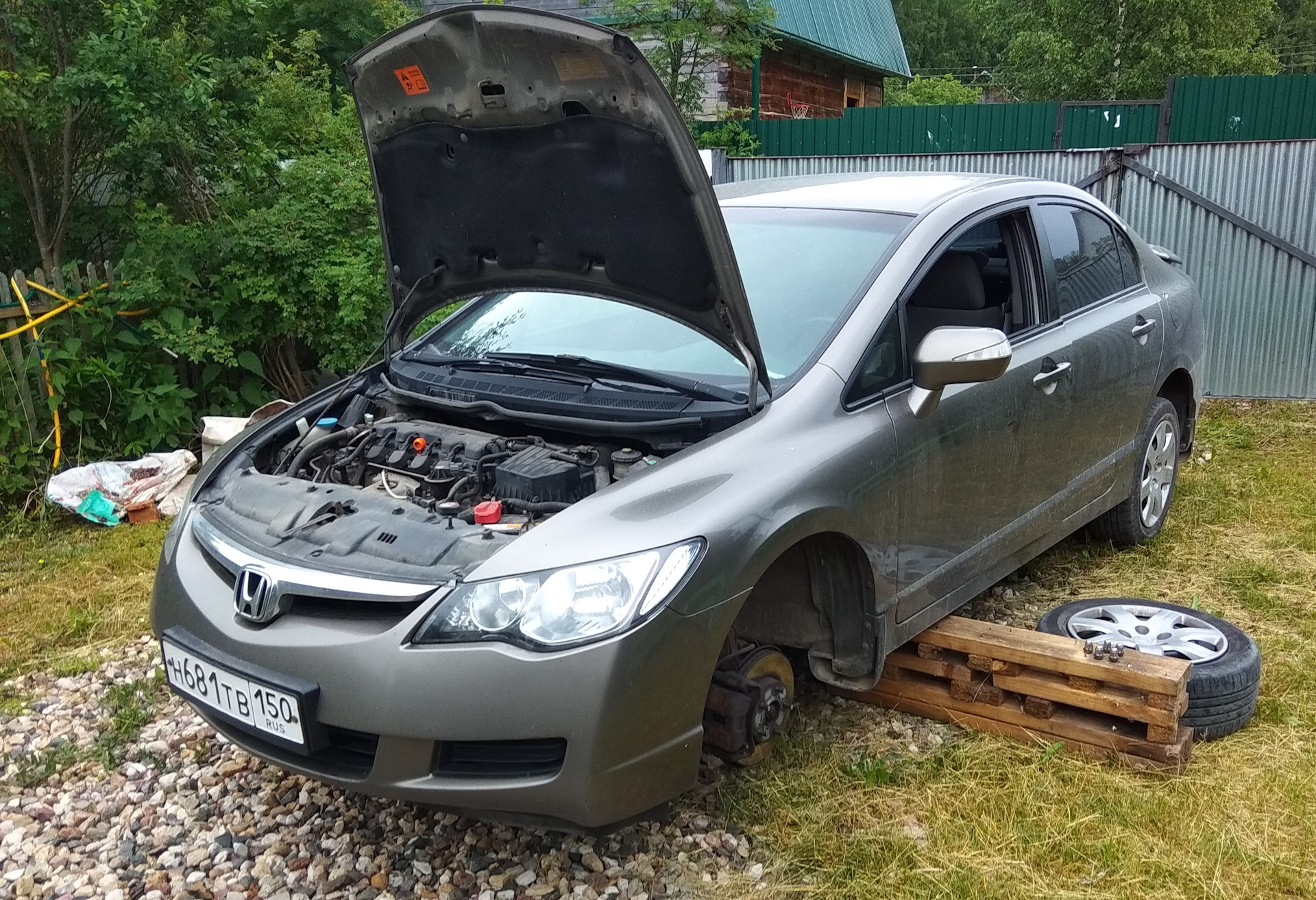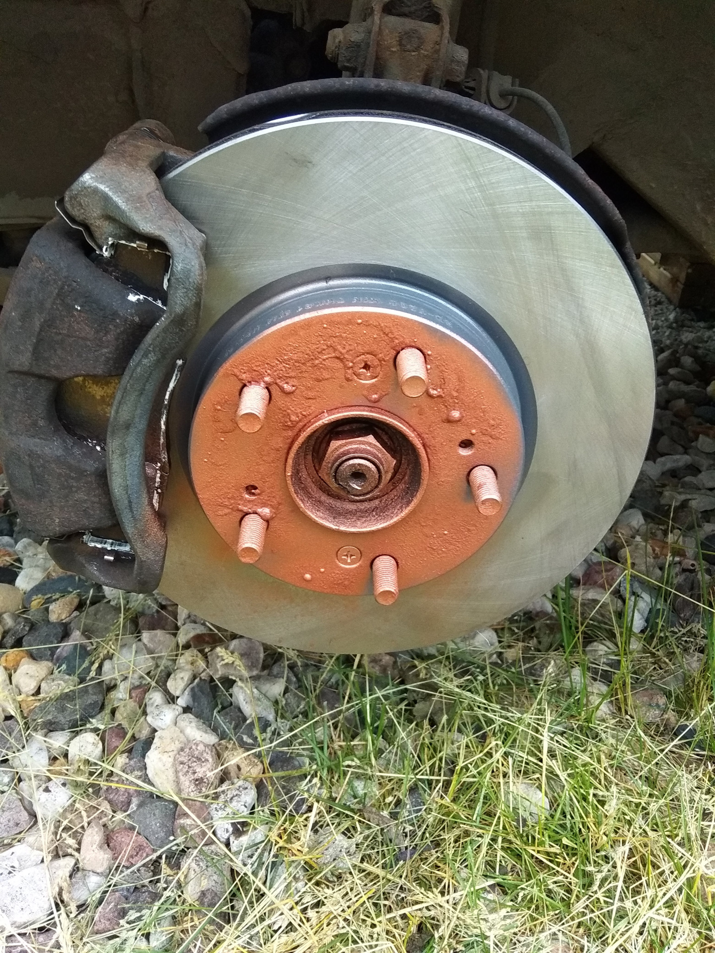 В последний раз лицезреем старые, ржавые, но еще рабочие тормозные диски и меняем всё на новое.