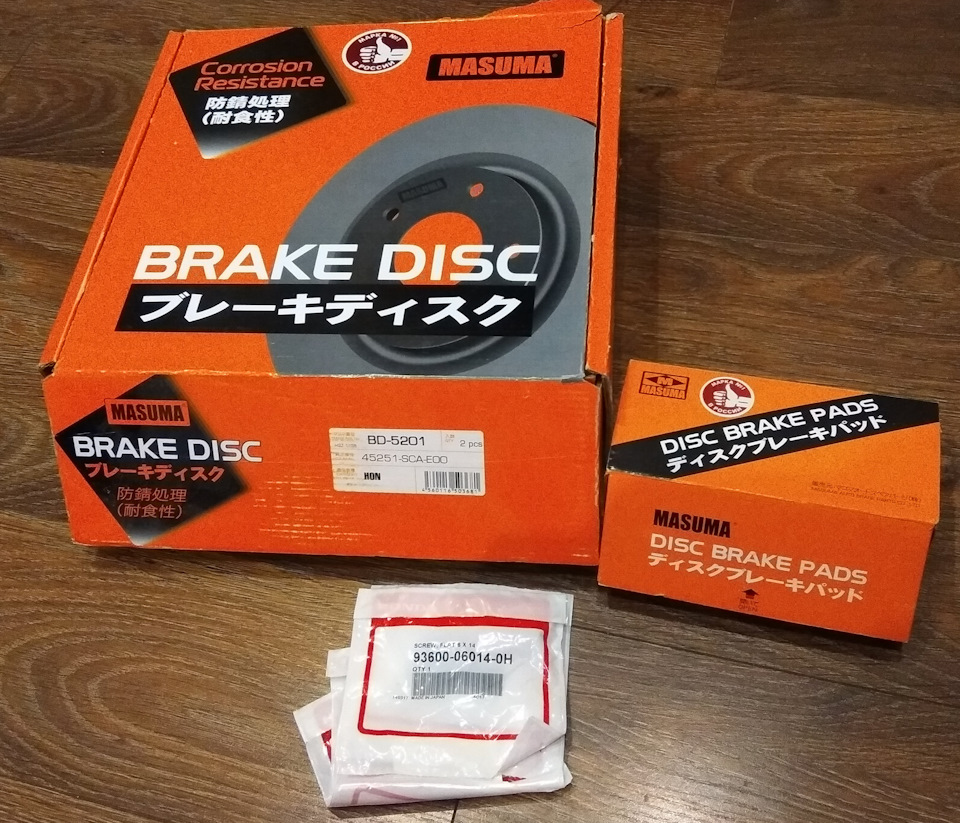 Всем Ку. Еще зимой компания Masuma подогнала очередную партию ништяков на тест, а именно тормозные диски. Колодки были получены еще в прошлый раз. И вот наконец-то выдалось время всё инсталировать на авто. Делать хотел исключительно сам, без всяких сервисов и дополнительных трат на них. Докупить пришлось только винты крепления тормозных дисков в размере 4-х штук, т.к. не знал открутятся старые или нет.