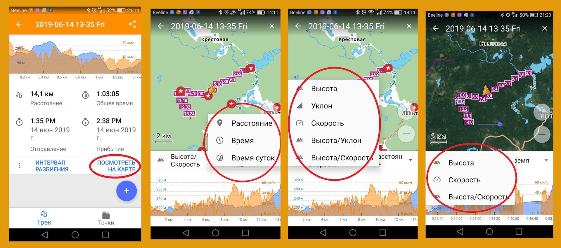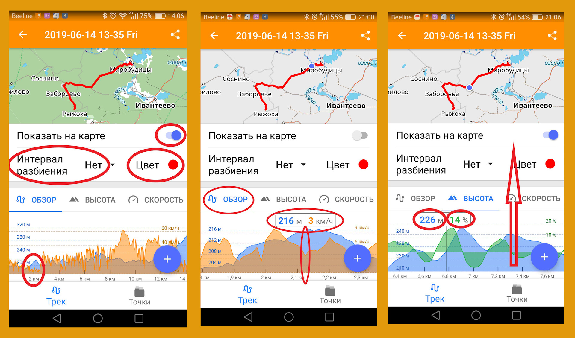 Если ткнуть в середину графика, появляется курсор с указанием текущей скорости и высоты. А на карте трека появляется метка, бегающая и показывающая в каком месте трека Вы сейчас находитесь.