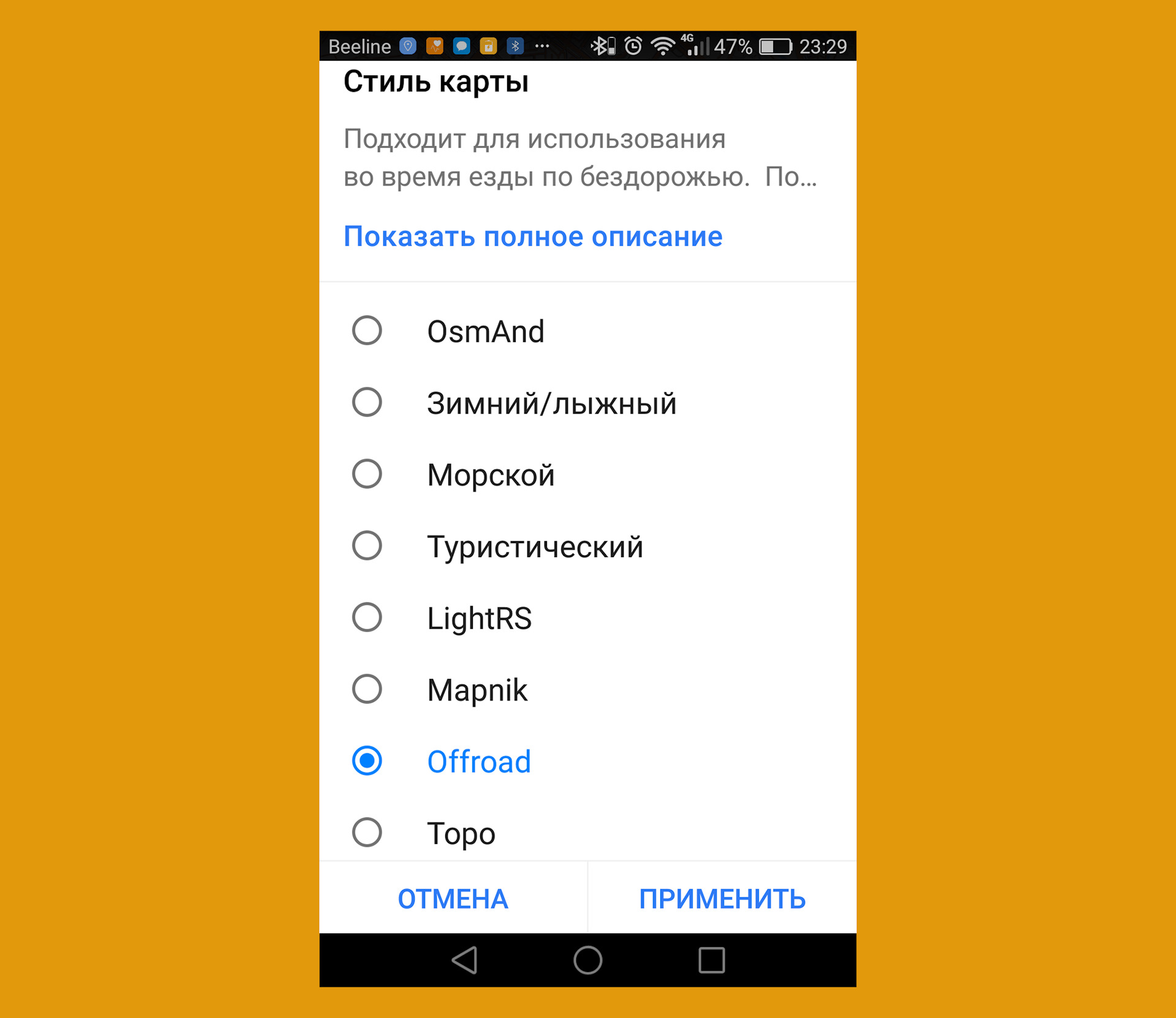 Так же интересен пункт «Стиль карты». В городах я использую стандартный «OsmAnd». За городом «Offroad» или «Topo». На воде можно включать «Морской» режим. Присутствует описание каждого стиля.
