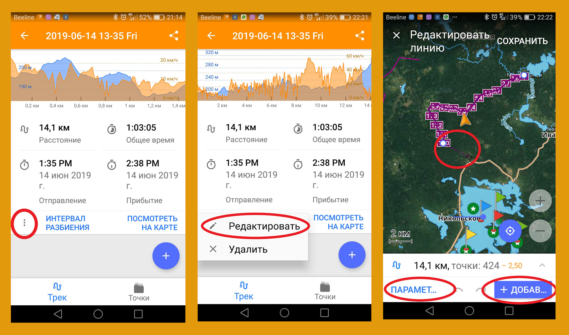Трек: Запись, сохранение, импорт, поделиться, показать на экране, следовать.
