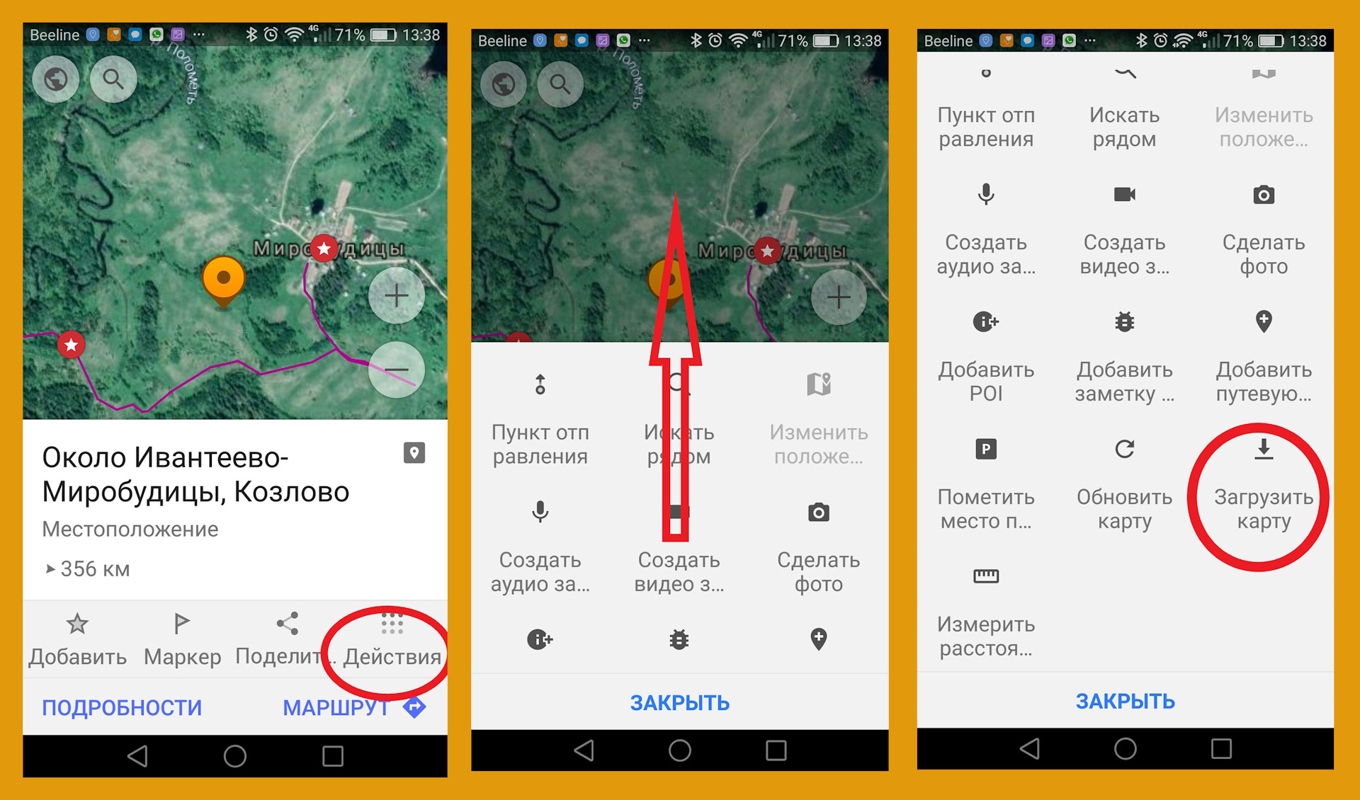 Далее перемещая карту и меняя её масштаб, размещаем на экране ту область, которую хотим скачать. Далее «Длинный тык» в карту. Из меню выбираем «Действия».