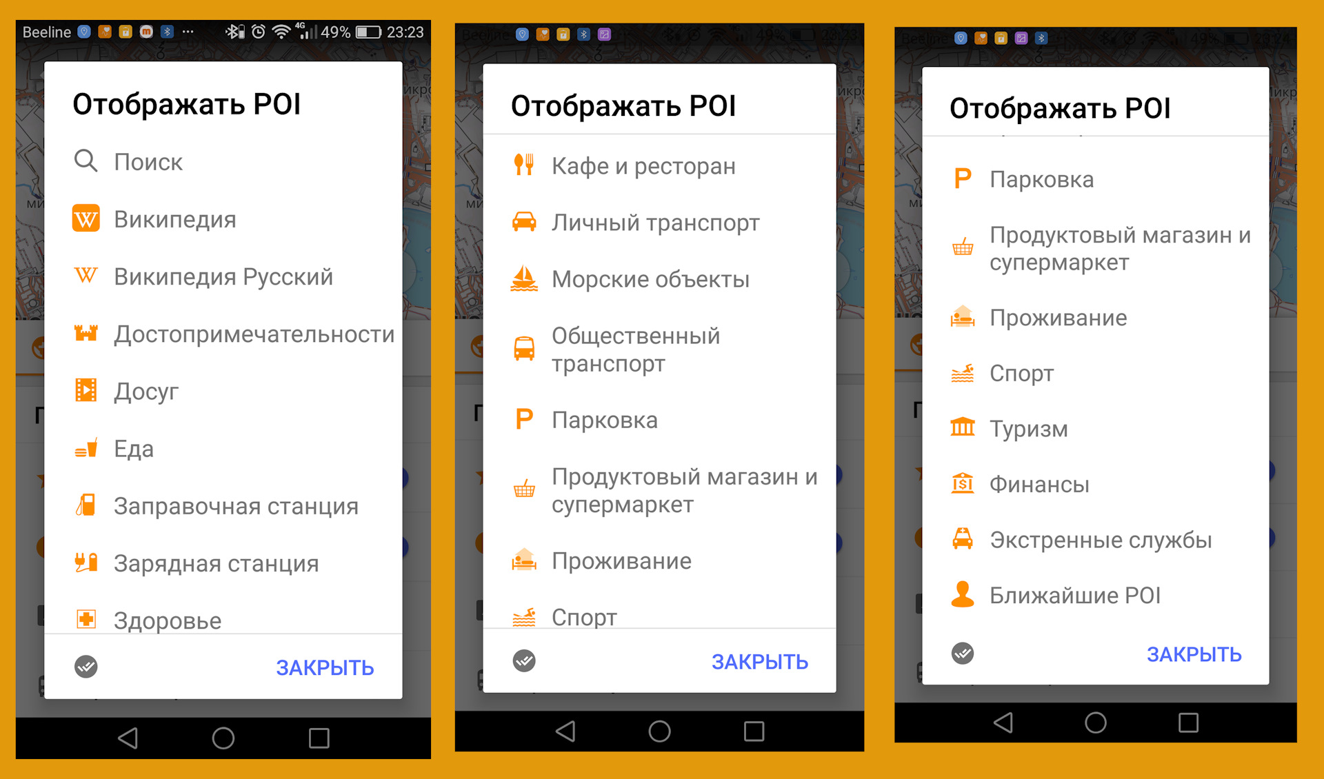 POI отдельными фильтрами можно настроить и только их можно включить! При этом их еще и произносить османд будет, если голос ТТS подключен. И выбор пои можно сильно специфицыровать. Например не только не все автомобильные показать, а только заправки. А из заправок не все, а только газовые. А из газовых только метановые или только пропановые.
