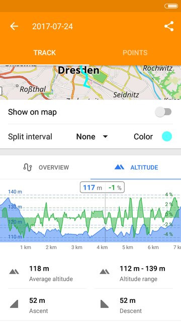 При желании Вы можете выбрать отдельные вкладки для графиков скорости и высоты. Причем, на графике Высоты Вы ещё увидите Уклон в %!