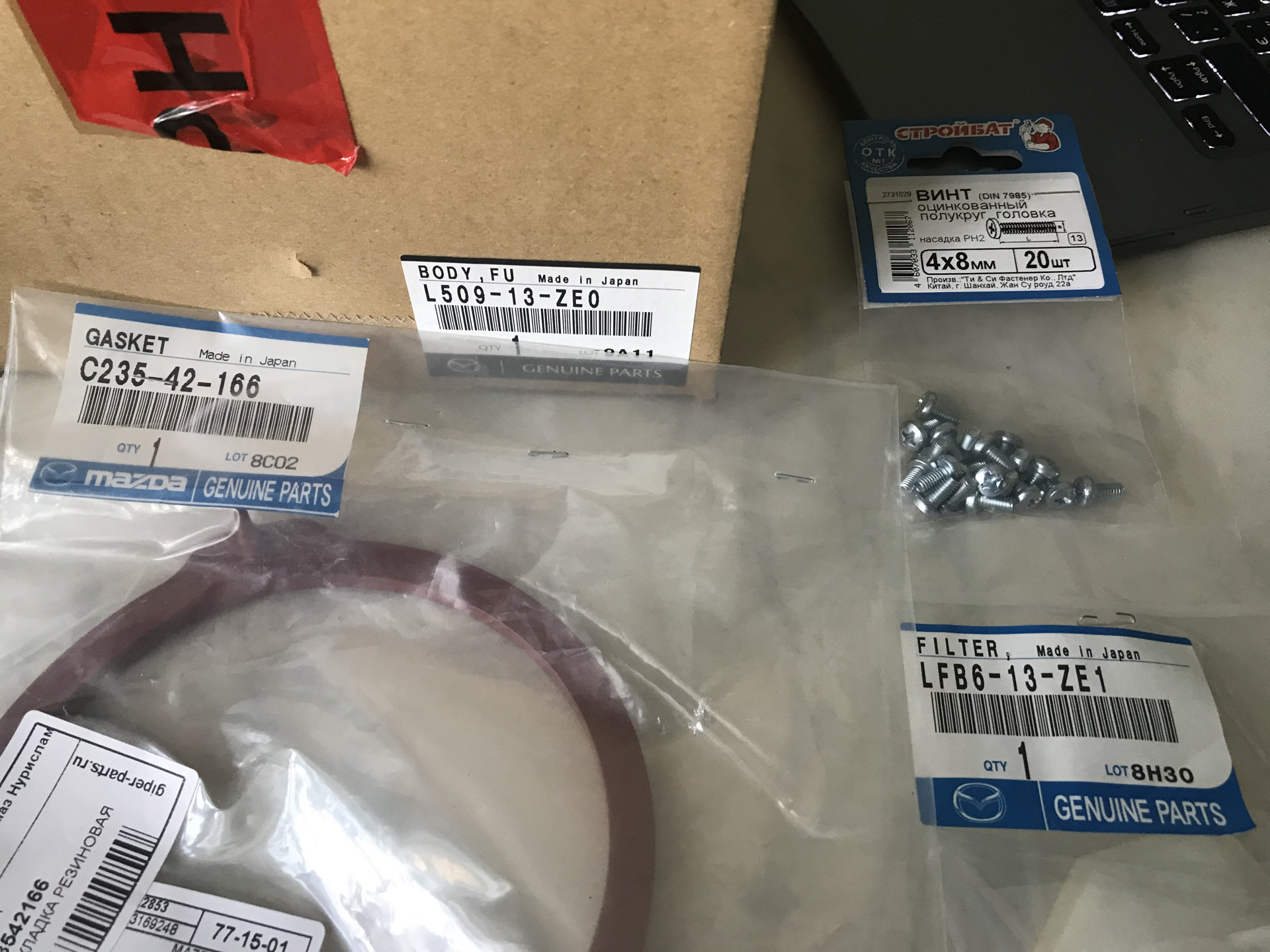 Заказал топливный фильтр, так как пробег уже 170000 тыс.км. Заказал оригинал, грубый, тонкий фильтр и прокладку, и винты. На счет винтов япошки конечно заломили цену от 25 до 70 рублей за штуку. Купил в леруа за 22 рубля 20 штук. Буду менять сам. Вроде ничего сложного. Заранее решил открутить винты, 7 штук поддались, а 1 все таки сорвался. За запчасти заплатил 4400 рублей.