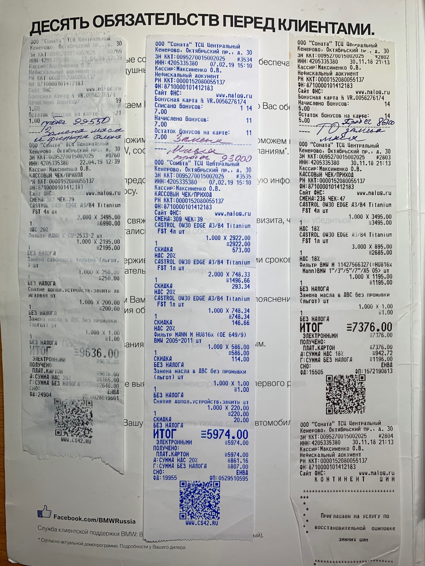 Сохранены, практически, все чеки и заказ — наряды на обслуживание автомобиля. Немного, конечно, в сумбурном порядке. Также, некоторые работы (изначально) проводились у дилера. Сейчас, обслуживаю у своих мастеров, но квитанции об оплате сохраняю, хоть и не выглядит это официально. Тем не менее, так проще отследить, что и на каком пробеге менялось. Также, вы можете посмотреть некоторые цены на запчасти и работы и сравнить их со своими.