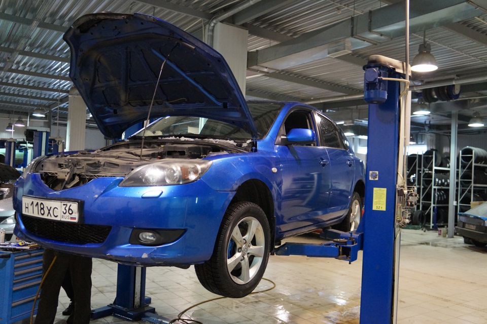 Откопав машину, потихоньку пополз в сервис. Город парализован, снег к тому моменту шел уже почти сутки. Все ползли как черепахи. Резина показала себя в очередной раз с хорошей стороны — зацеп отличный, гребет на уровне. Снега по порог, но машина уверенно ползет вперед. Ну конечно также помогала система DSC. Доехали, с трудом заехав в сервис (эти лентяи не хотели чистить снег). Щетками смели снег с машины, подождали пока стечет с машины и на подъемник.