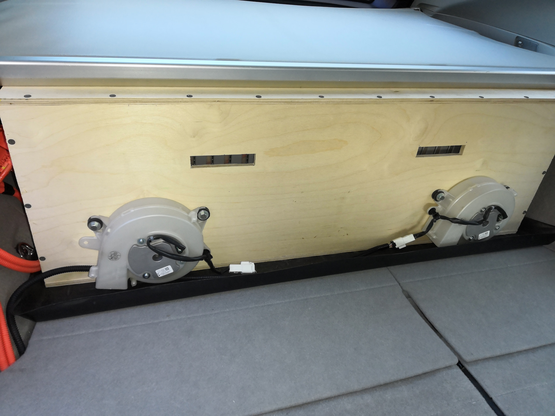 По компоновке доп. батареи были разные мысли. Расположение в салоне требует слишком глобальных доработок интерьера. Очень подмывало расположить аккумуляторные блоки скрытно, под полом багажника, вместо вещевого кармана в корме. Но по соображениям безопасности, в случае ДТП в заднюю часть авто, аккумуляторные ячейки могут повредиться с непредсказуемыми последствиями. Поэтому выбрал наиболее безопасный и простой в реализации вариант. Корпус спереди упирается в спинку заднего сиденья, а для более надёжной фиксации крепится стропой к откидным петлям по бокам.
