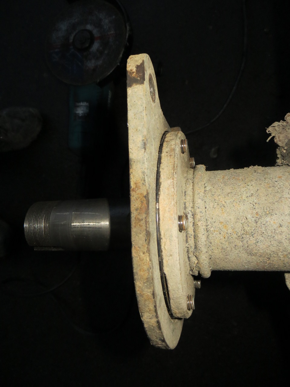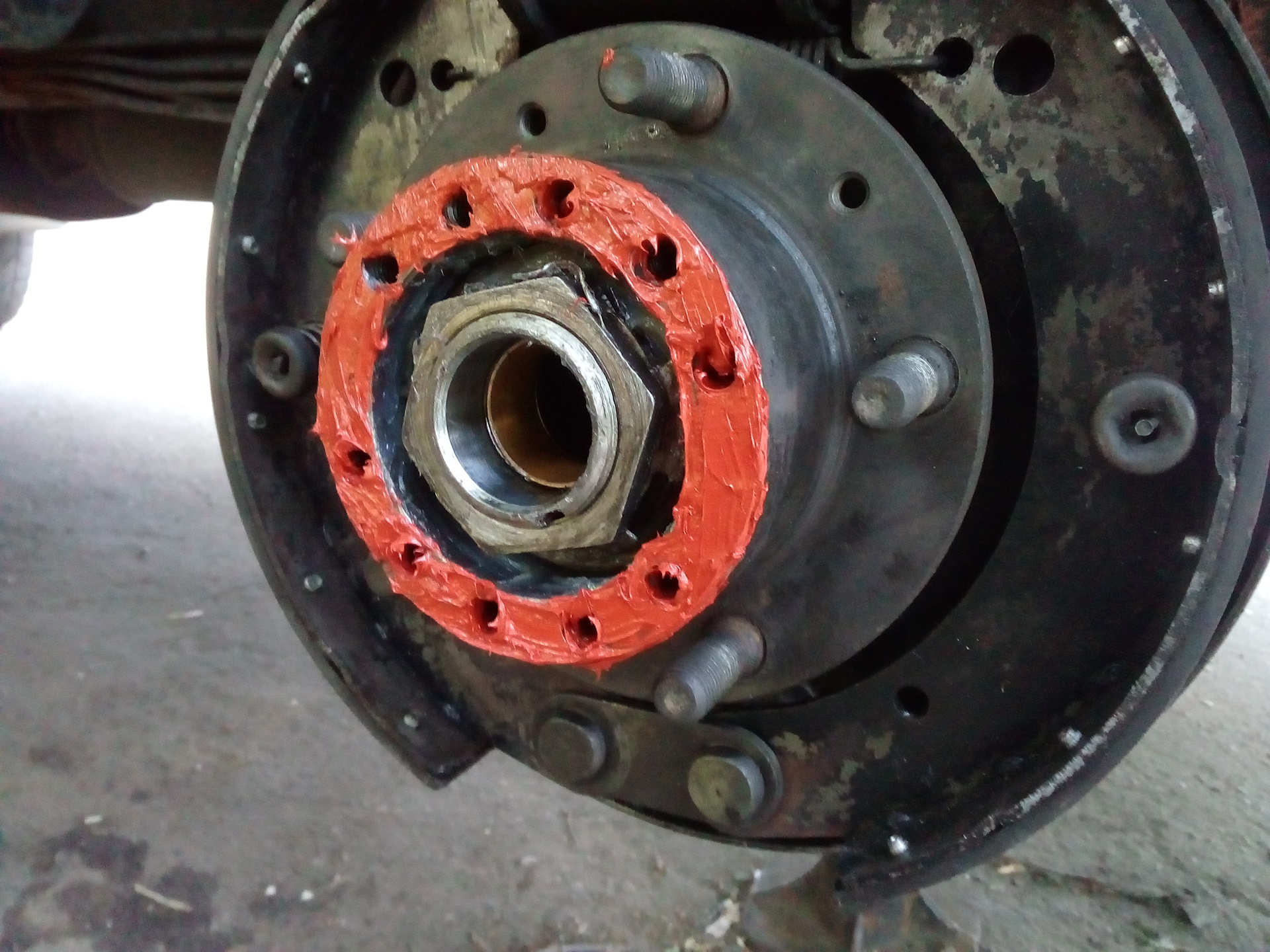 Через герметик на мост была прикручена новая цапфа и флянец дискового тормоза.