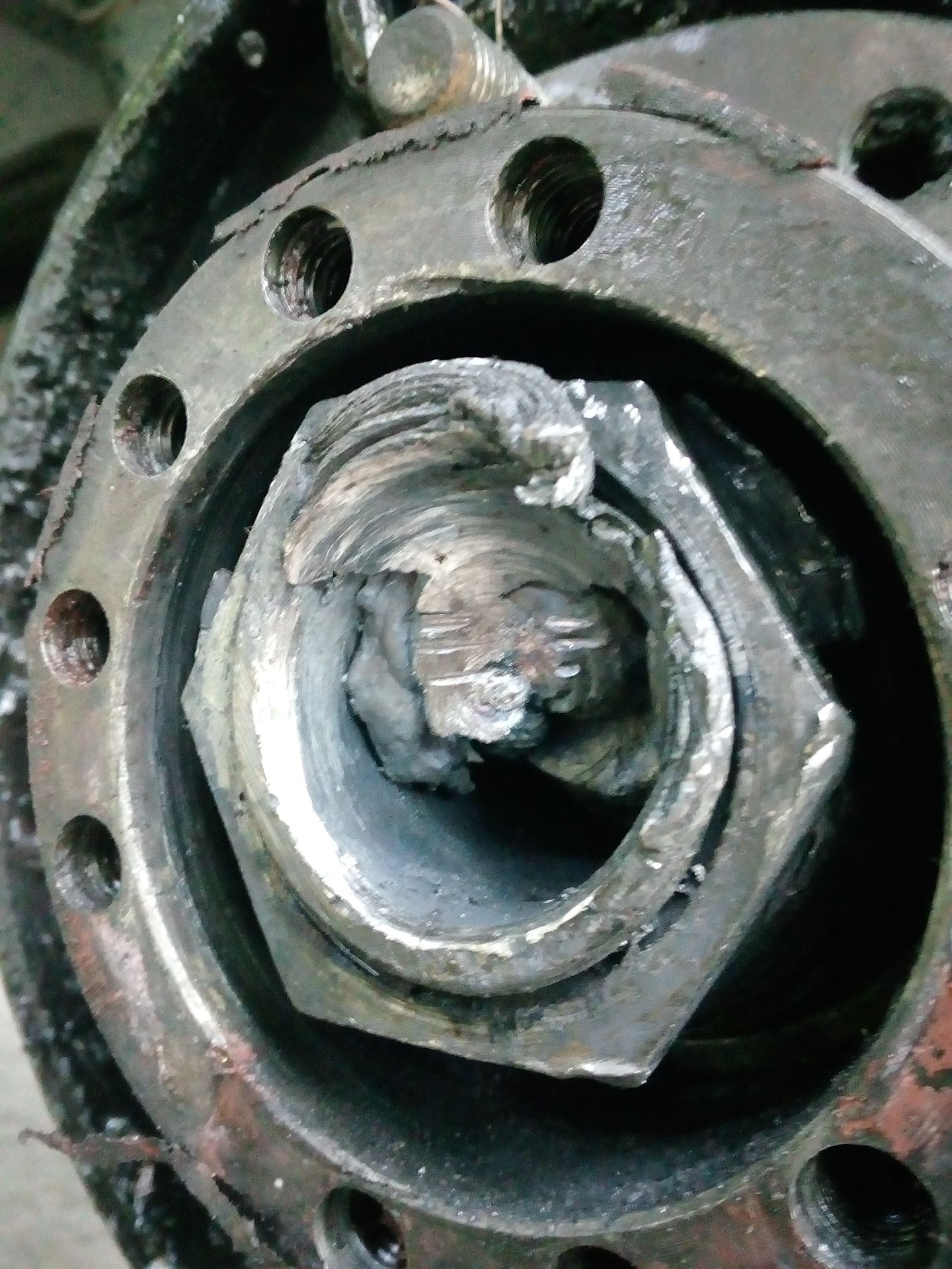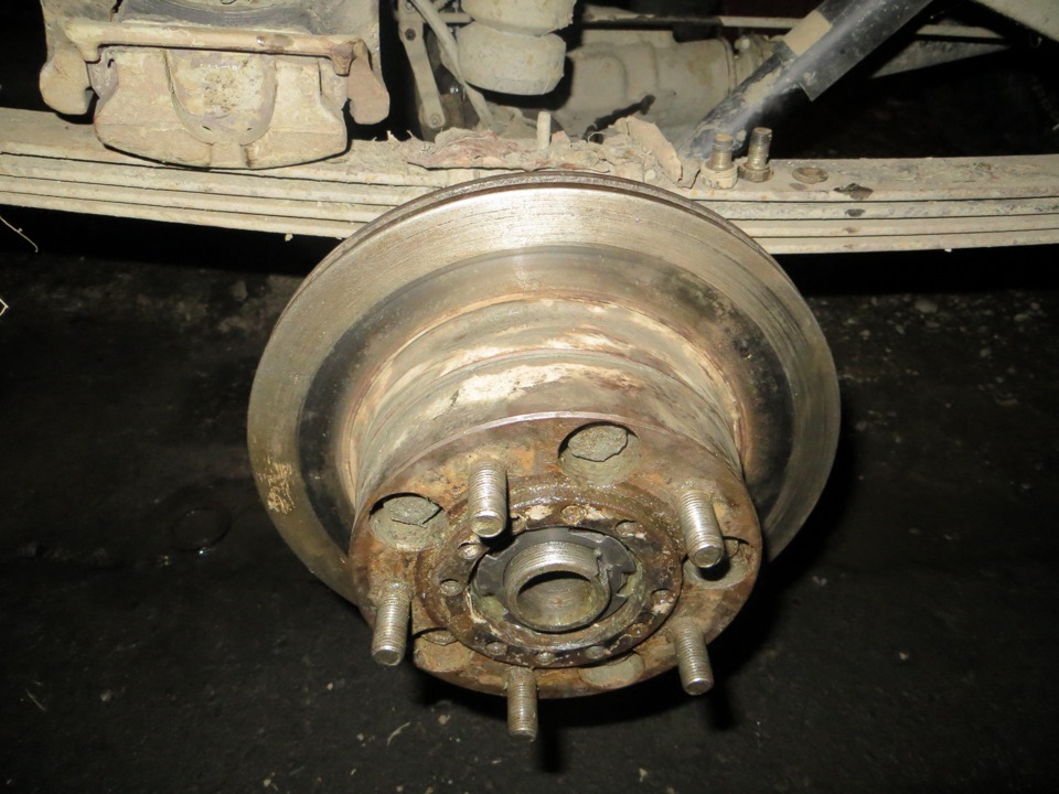На днях случилась неприятность… При движении по асвальту началось какое то подклинивание в районе заднего моста. я подумал что скорее всего дело в редукторе, ну там сателлиты или подшипники дифа сдохли). При вскрытии моста обнаружилось что все в "порядке", не считая стакана грязи вместо литра масла))) пришлось все собрать наместо. Решил поддомкратить колеса и посмотреть состояние ступичных подшипников. Заднее левое колесо подклинивало в суппорте и болталось во все стороны… При разборке оказалось что рассыпались подшипники, поломалась гайка крепления ступицы, сломало внутреннюю обойму наружнего подшипника и раздолбало в хлам резьбу, да и саму цапфу тоже не пощадило)