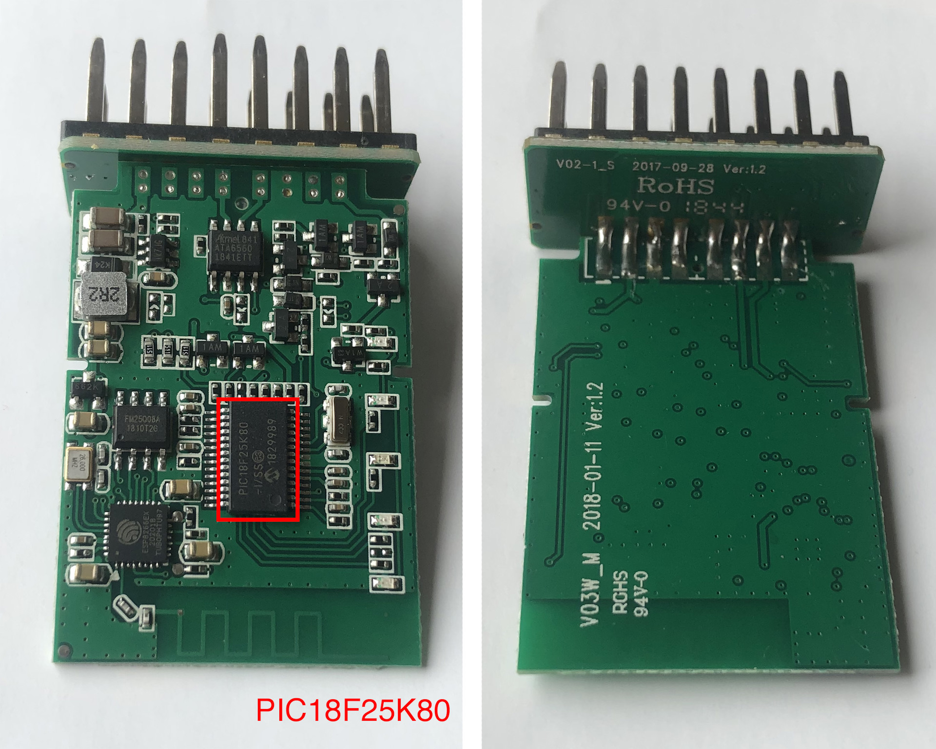 Помимо того, что в кривом адаптере используется неизвестная микросхема, залитая компаундом, есть отличия и на уровне работы прошивки. Китайцы поняли, что версия 2.1 продается плохо и стали переделывать ее на версию 1.5, при этом они изменили только номер прошивки, а не функционал. Версия 2.1 не поддерживает работу со многими протоколами. Также может быть и другая микросхема с маркировкой PIC18F25K80. Вот хорошая статья про кривые адаптеры: