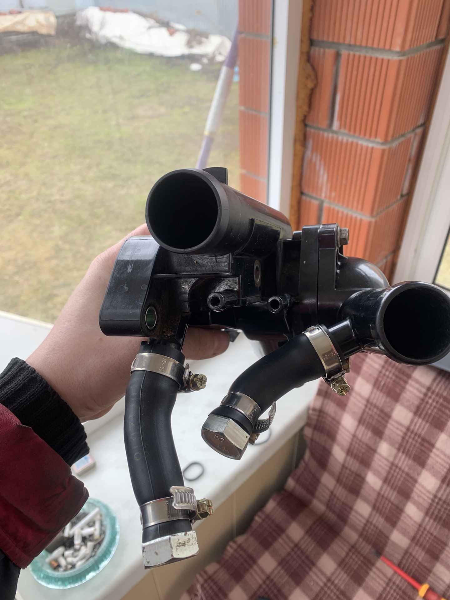 Прикрепляю корпус термостата на свое место, собираю все шланги, и встаю в ступор, туда куда одевается шланг с радиатора, он не встает, потому что мешает железка! У моего корпуса этот отвод смотрел в бок, а тут он прямой, когда собирал я не сильно думал что может что то помешать. уехал с дачи называется, собрал машину…