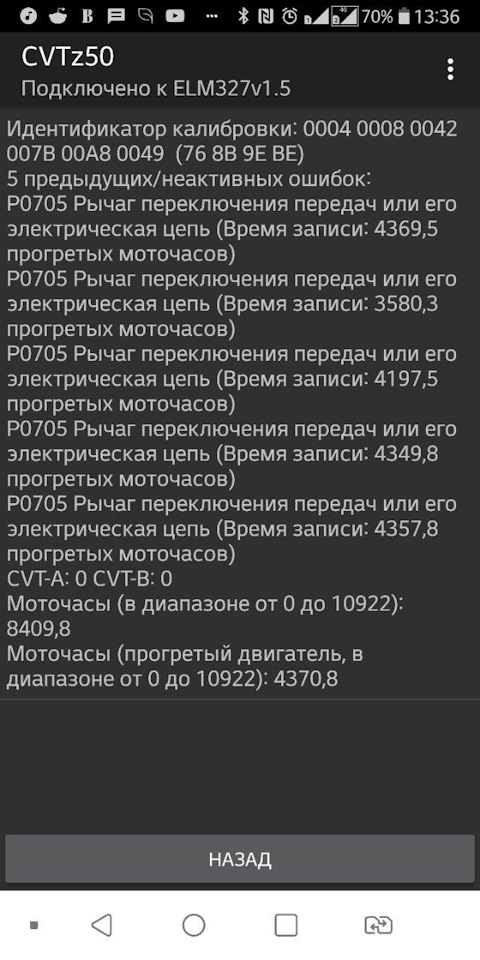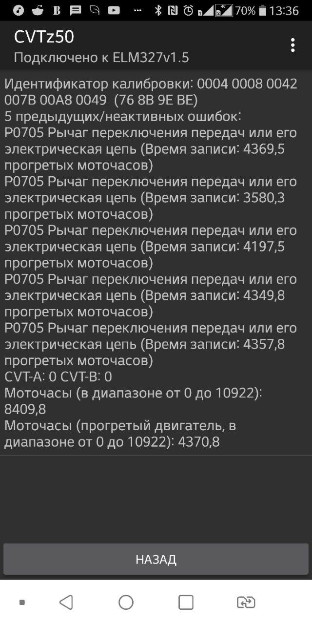 Да, и, собственно, почему "снова" — первый раз я с этой ошибкой столкнулся в прошлом году. Спускался с городищенской горки в Брянске, в пробке, скорость движения указанная в записи. Было это приблизительно в августе. После чего вплоть до середины июня, когда по Брянску вновь ударила жара +32-35, ошибок по варику не было. Когда забирал машину, в логе диагностики были только Р0705 (все 5 шт, которые доступны через CVTz50). Ну и на диагностике это выглядит вот так вот.