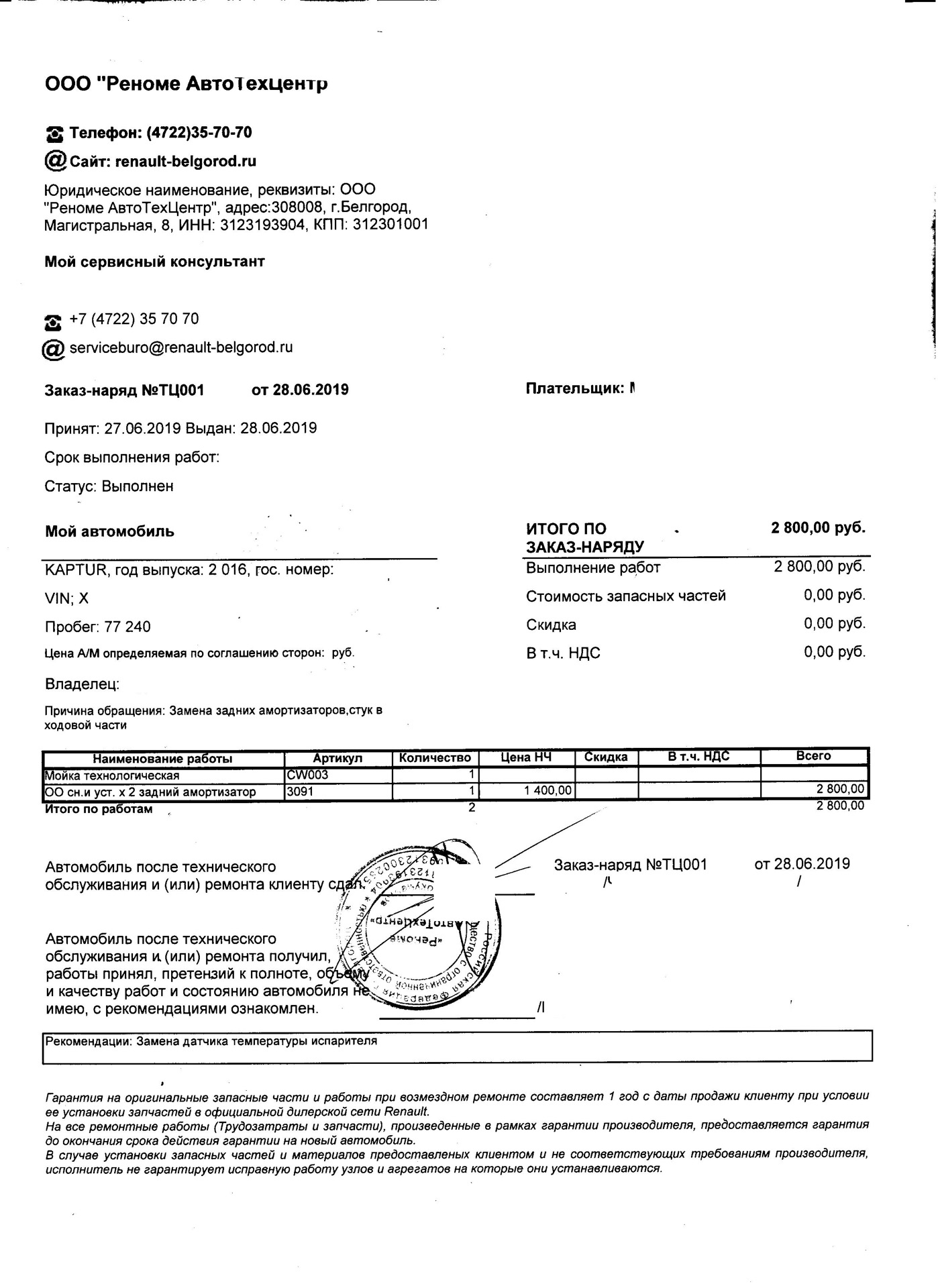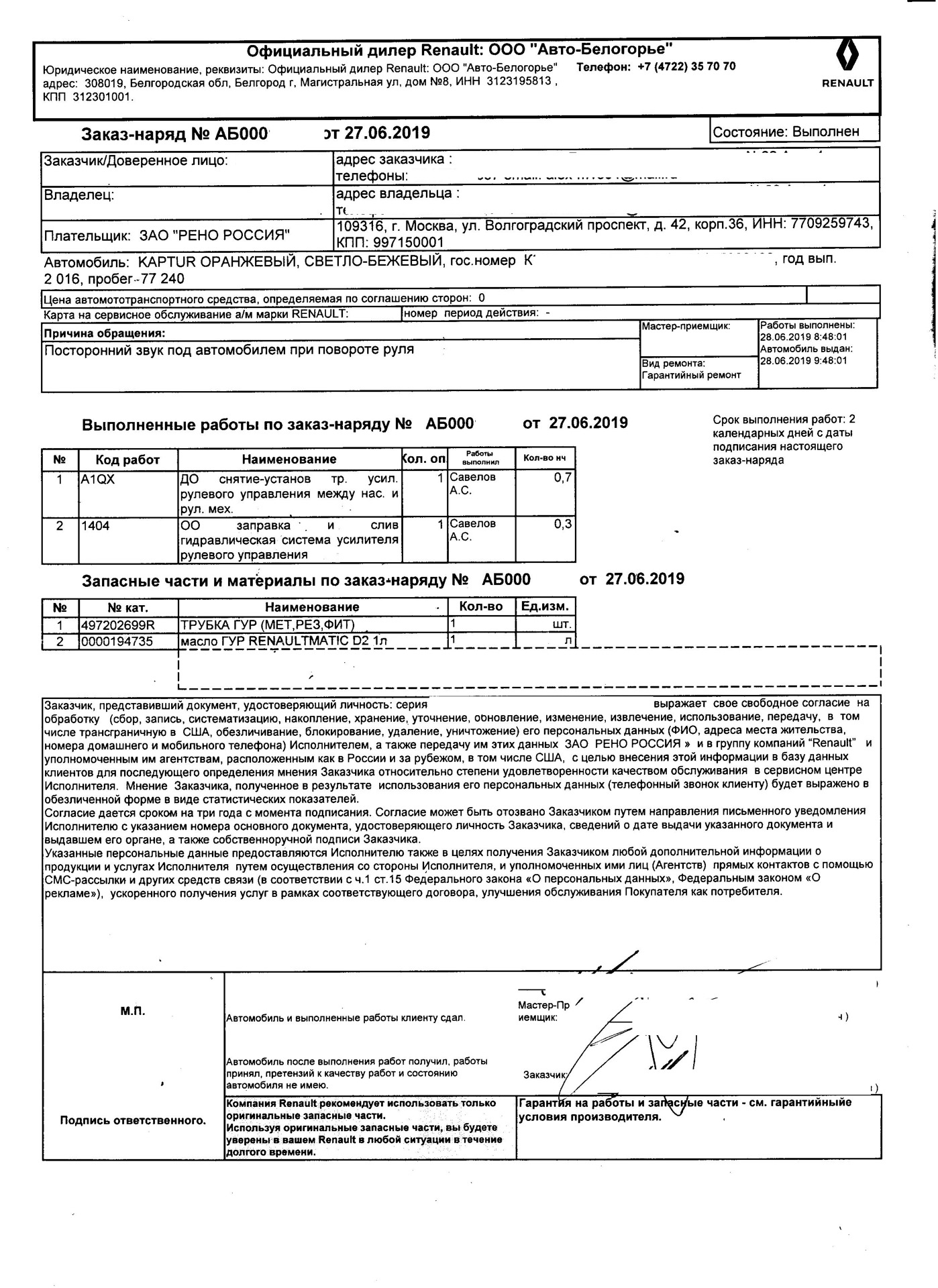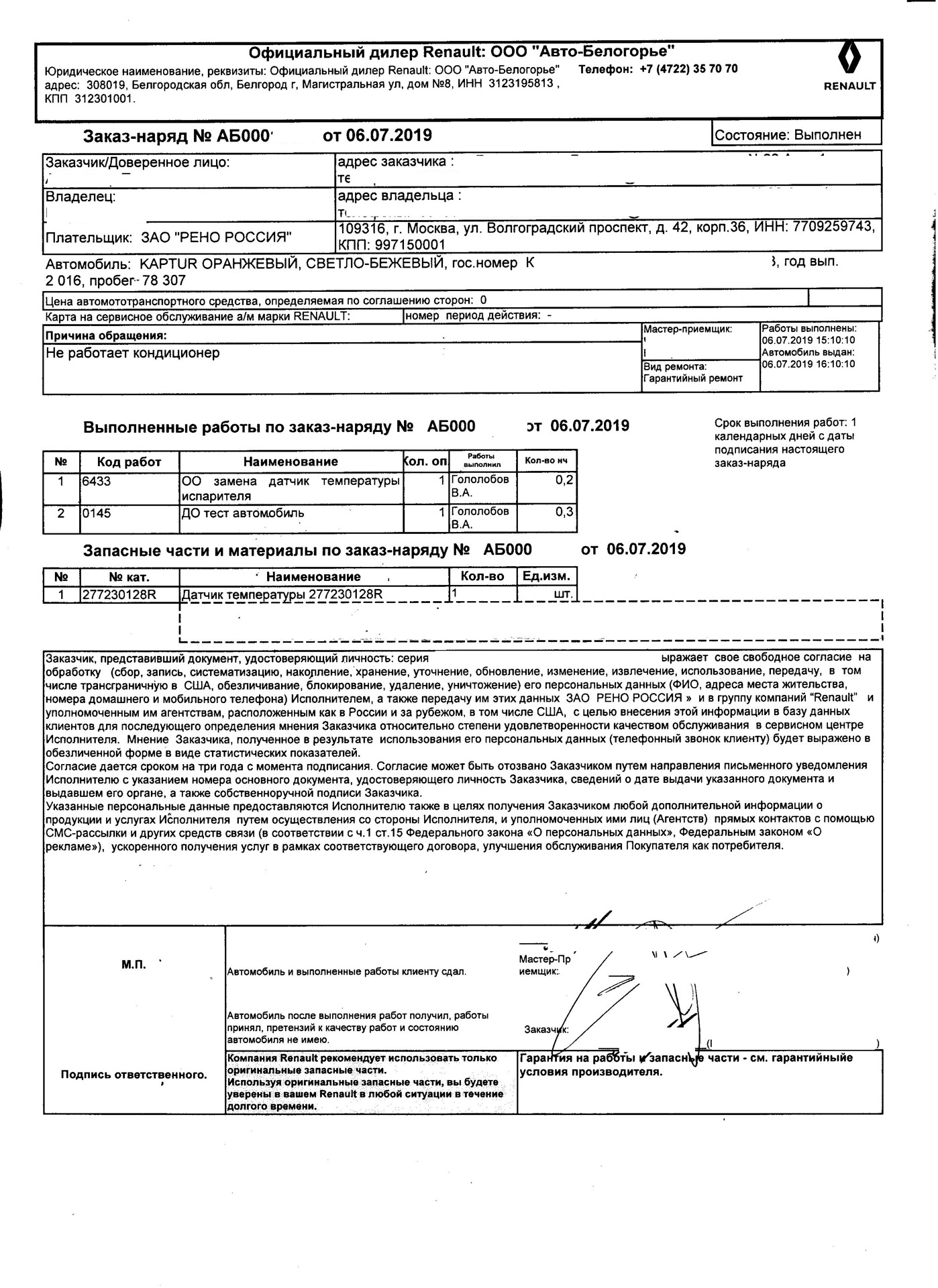 Итак произведены следующие виды гарантийных работ: