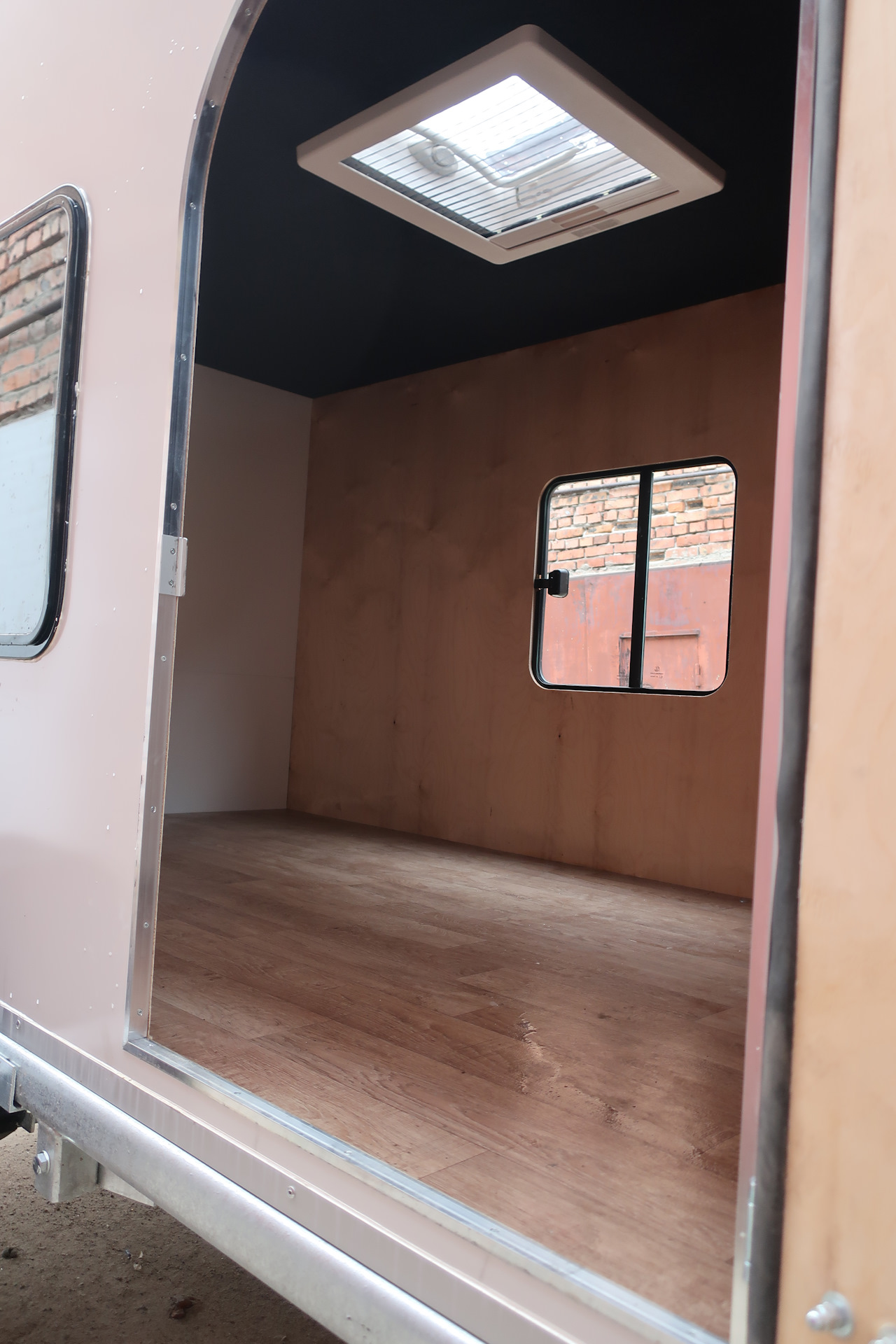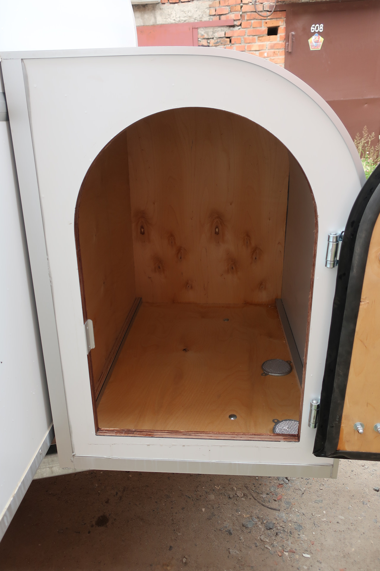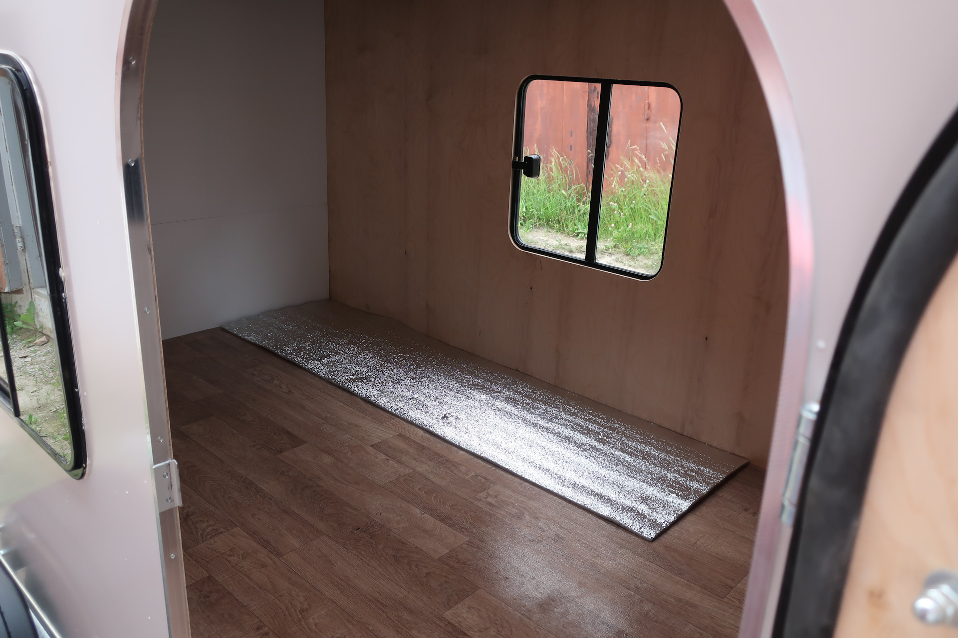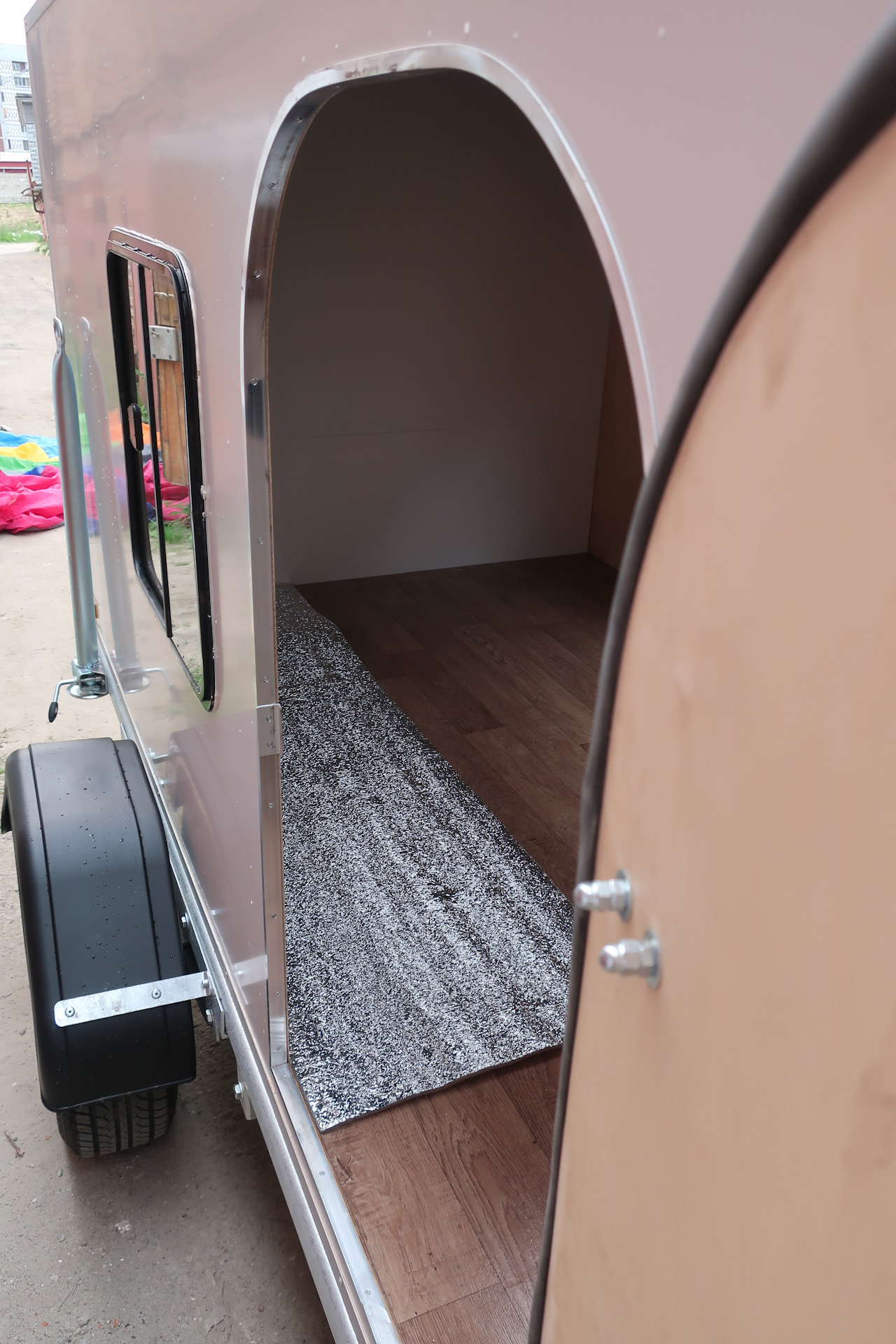 Прицеп "Кочевник 1" производства КаменскАвто. Жилой, тиардроп не с классической каплеобразной формой а более удобный для меня коробок. Прицеп заказывали пустой, без кухонной зоны и переборки для неё в задней части, мне она не нужна. По причине отсутствия кухни заднюю стенку я захотел тоже не распашную а глухую, прицеп от этого только крепче будет. Подкатное колесо стандартная комплектация, дополнительно был установлен люк на крышу с москитной сеткой и задняя опора одна (Но приехав я купил вторую, так как пришел к выводу что мне так будет удобнее. Её я поставлю уже дома сам).