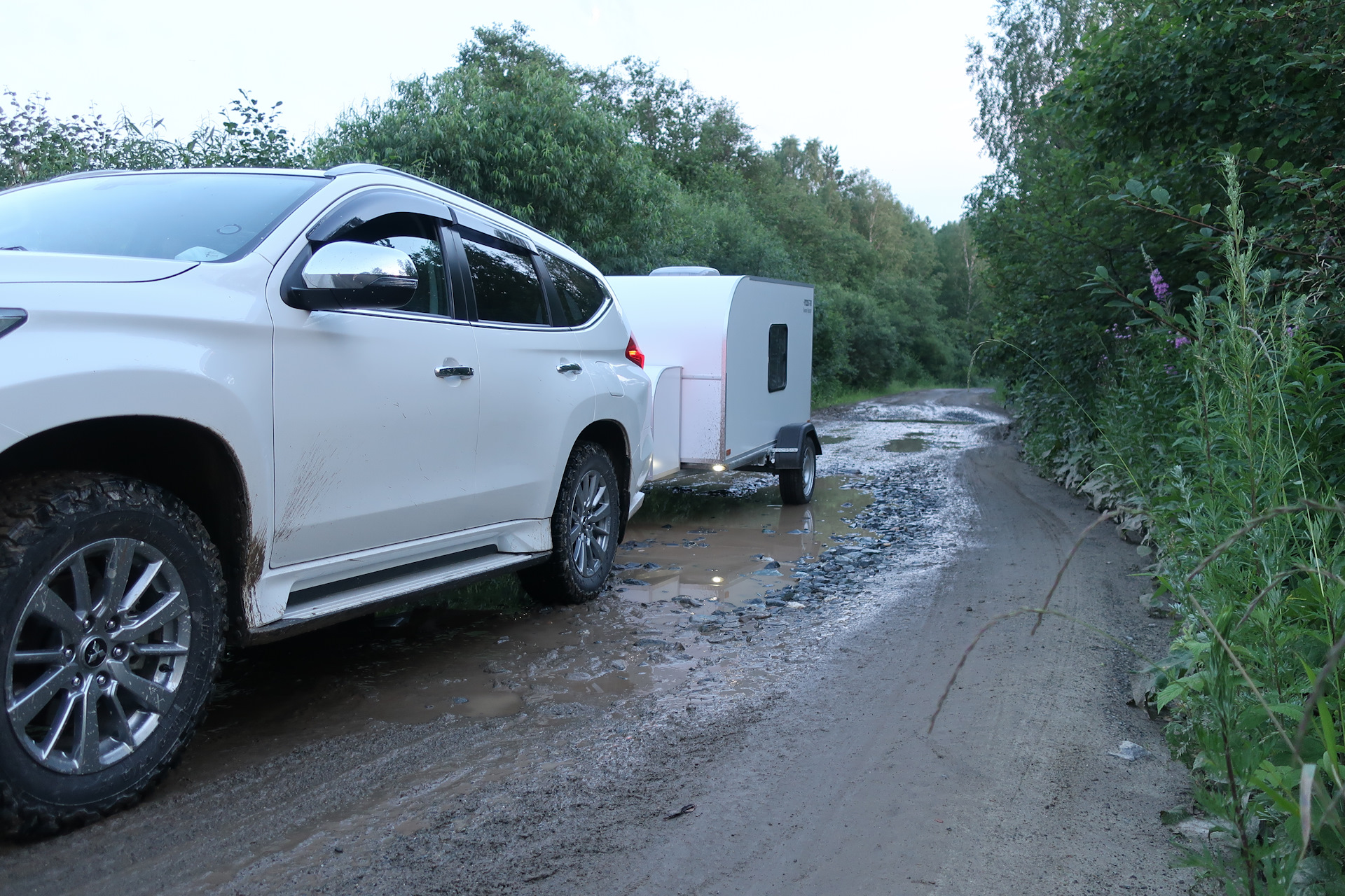 Но переехав трассу Е22 навигатор и паджеро спорт сыграли со мной злую шутку. У меня на навигаторе не стоит галочка "избегать грунтовых дорог". Смысла их избегать нет, когда машина даже сразу из салона на штатной резине может по пашням ехать если они не размыты дождями. А на АТ-шке тем более смысла избегать их нет. Но вот прицеп изменил расклад всё-таки. Не смотря на то что он вполне позволяет ездить по грунтовкам без жесткого оффроада, его конструкция всё-таки не предназначена для того чтоб топить по бездору на все деньги. Тут недавно на драйве как раз была пикировка одного из производителей и их клиента, который на рамнике таскал каплю топя на все деньги, а после смерти прицепа пришел к производителю с претензиями. Я всё-таки считаю что надо голову включать когда куда-то едешь, и по этому сначала на плохом асфальте до города Асбест пришлось снизить скорость движения, а когда после него пошла грунтовка скорость снизилась ещё сильнее.