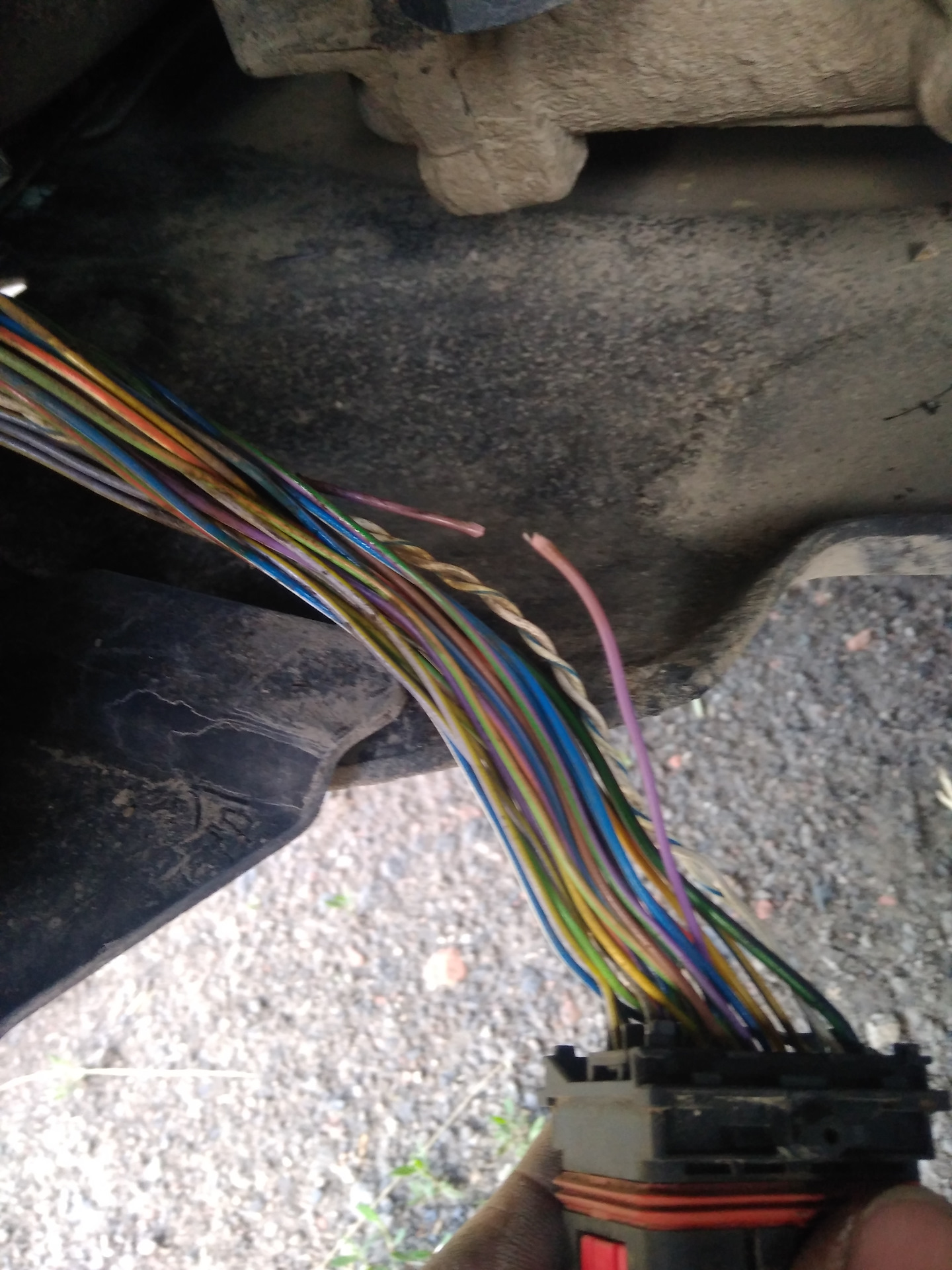А вот дальше, к блоку PCM цепь терялась… Вскрывать проводку Ох как не хотелось, начал осматривать видимые части проводов… И Бинго! На внешне целом проводе имелось чуть заметное повреждение изоляции. Чуть потянул и результат на фото.