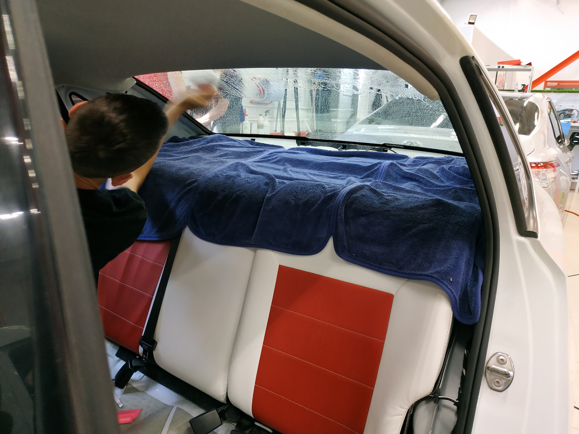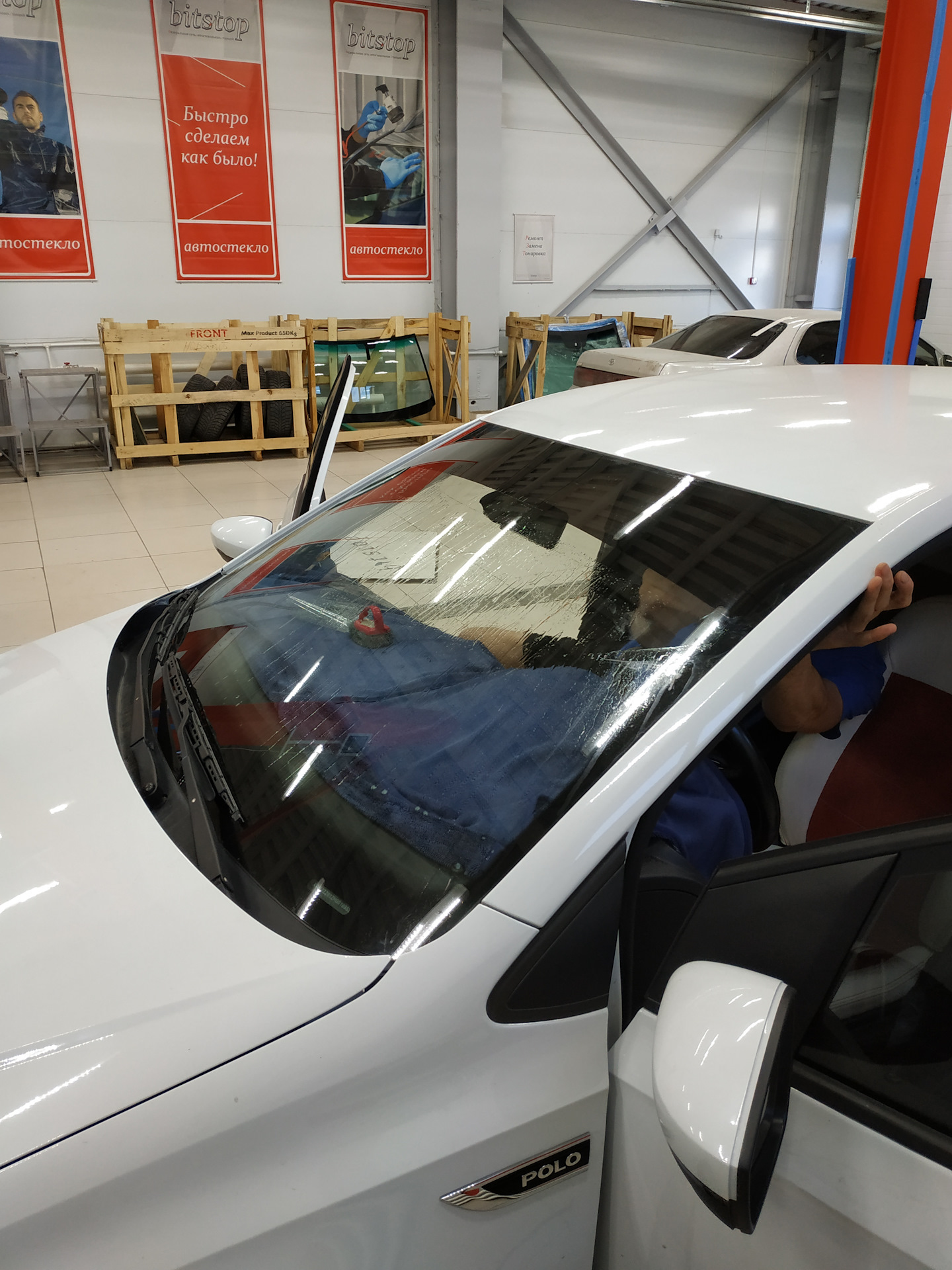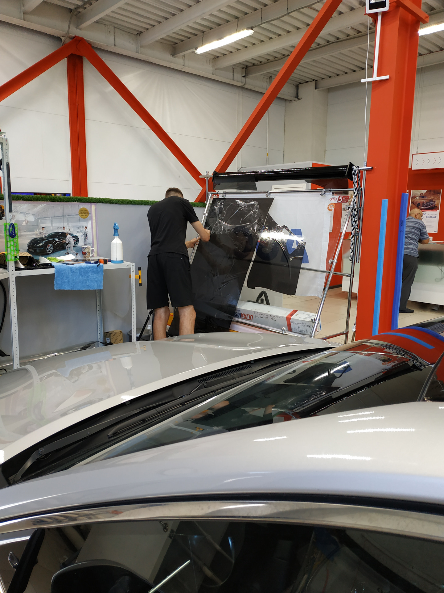 В светлом и чистом боксе можно следить за кропотливым процессом тонировки, а также любоваться преображением автомобилей, которым устанавливают "лобовики". Важно! Не путайтесь под ногами специалистов. Они вроде и улыбаются, но там работает Анатолий, а он два раза повторять точно не будет😂.