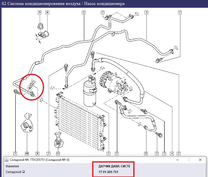 Для удобства снимаем бампер. В Месте отмеченное зелёной стрелкой, идет алюминиевая трубка и на ней находится датчик давления хладагента 7701205751 . Проверяем его разъём, очень часто он окисленный. Проверяем его проводку.