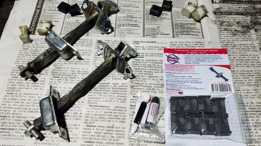 Заодно разобрался с ограничителями/фиксаторами дверей, поскольку задолбало постоянно получать по спине дверью, когда что-то кладешь или достаешь из салона. Заказал из Омска ремкомплекты фиксаторов от Пластик-авто, снял с дверей фиксаторы, разобрал и охренел. Все сухарики сточены практически в ноль!