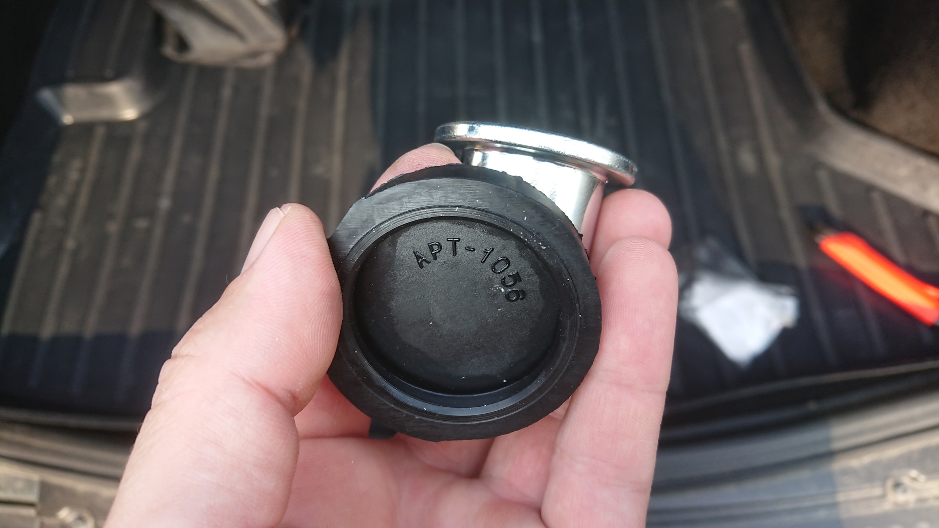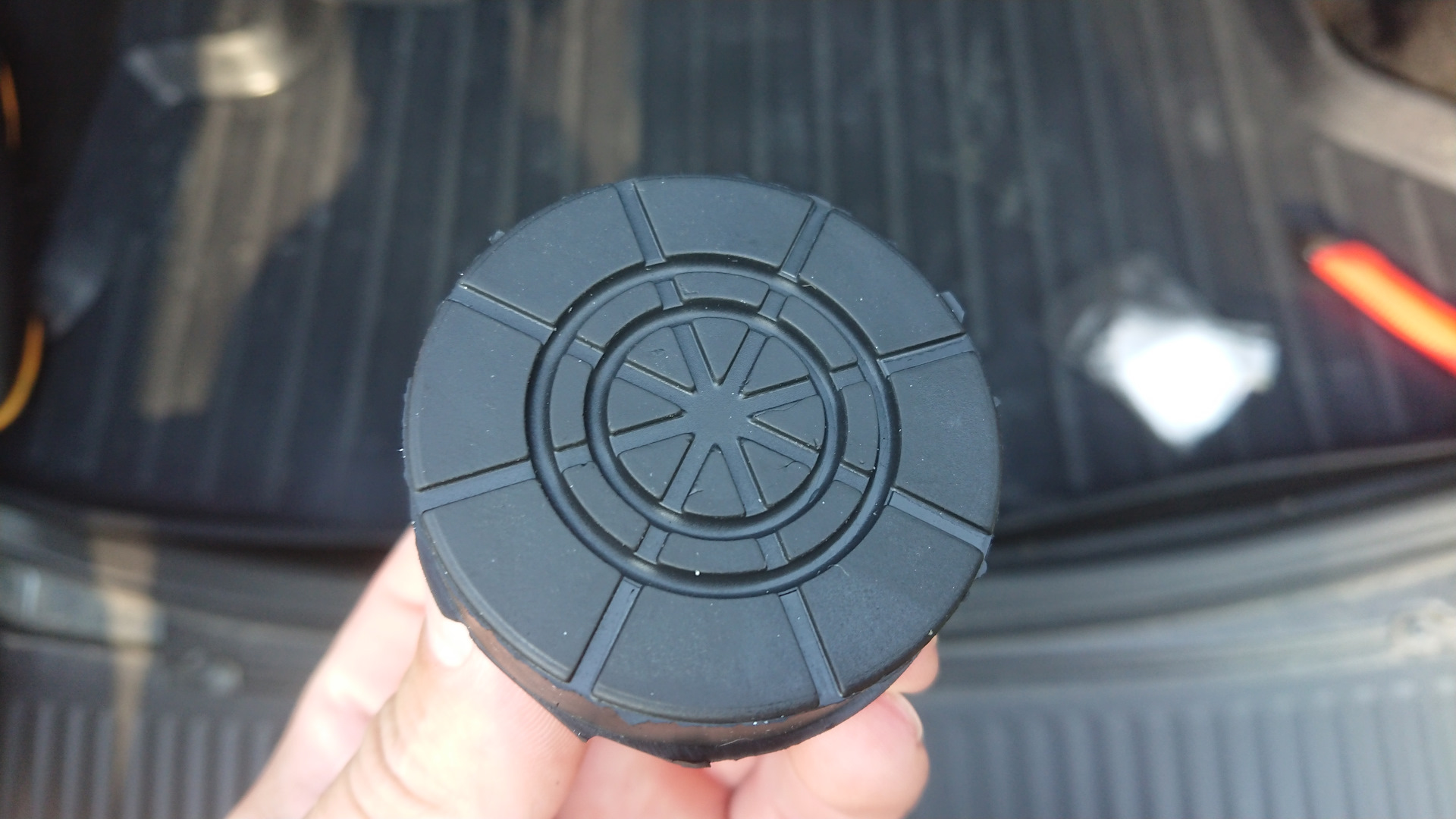 Получив на руки это изделие сразу же начал его испытывать, надел на домкрат, прицелился в лонжерон сзади, что бы было четко по центру и давай поднимать. Каково же было мое огорчение когда эта шляпа начала проваливаться в лонжерон, я даже толком заднее колесо не оторвал от земли, хорошо вовремя заметил, теперь вмятина посередине. Этот адаптер по ширине резинки как ширина лонжерона, а металлическая часть еще уже, вот она и проваливается между стенок лонжерона. Пробовал подкладывать обрезок доски, но тогда резинку плющит стягивает набок, да и сама эта шляпа съезжает с пятки набок ее диаметр 28, а у пятки 26, но когда опустил машину резинка осталась целая. Этот адаптер можно подкладывать только подо что-то плоское, если засунуть под рычаг, то скорее всего резина прорежется т. к. тонкая. По площади металическая часть меньше чем у родного ромбового домкрата, 1500 мм.^2 и 2000 мм.^2 соответственно