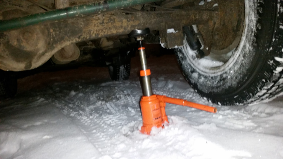 Сзади домкрат под мост, передок под рычаг или балку и нет проблем с мятыми лонжеронами и ободранными кромками порогов, один только момент — бутылочный домкрат очень опасно ставить под мост, я пятак немного переделал и машина уже не соскользнет с домкрата.