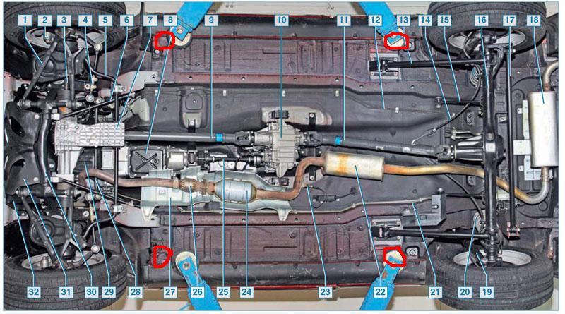 Есть специальные места под домкрат !