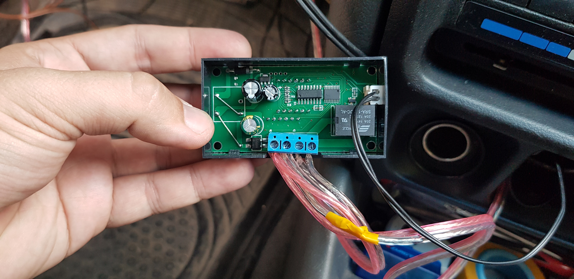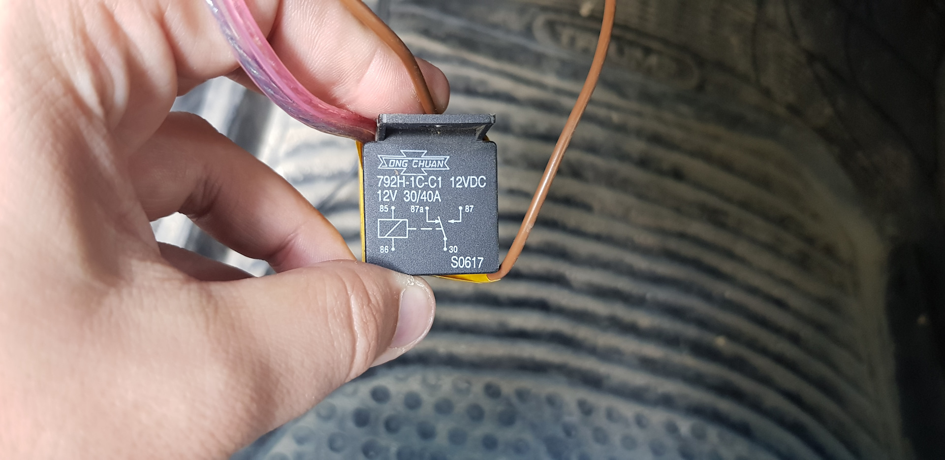 Хоть в самом термореле уже есть реле на 20А, я не стал цеплять к нему вентилятор (хотя как тест цеплял, работал отлично), а подключил через дополнительное реле, которое валялось в бардачке. Оно пятиконтактное, я его заменю на нормальное четырехконтактное, с площадкой под контакты.