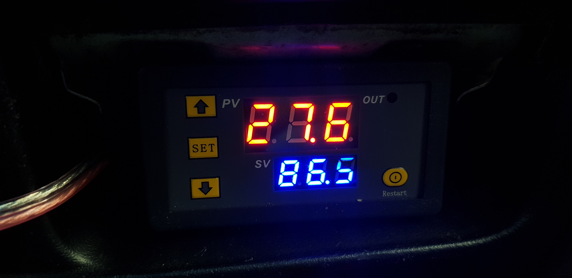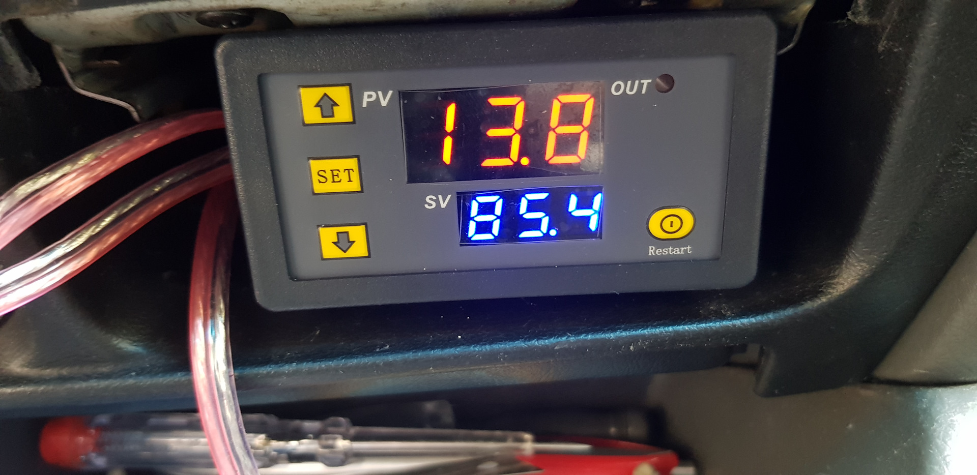 2) синими циферками вы выставляете необходимую температуру срабатывания реле, к которому подключается вентилятор. Нажимаете set и стрелочками можете менять её с точностью в 0,1 градуса. Например встали в большую пробку — уменьшили температуру срабатывания на 5-10 градусов, чтобы вентилятор срабатывал раньше и не допускал опасного приближения температуры к закипанию.