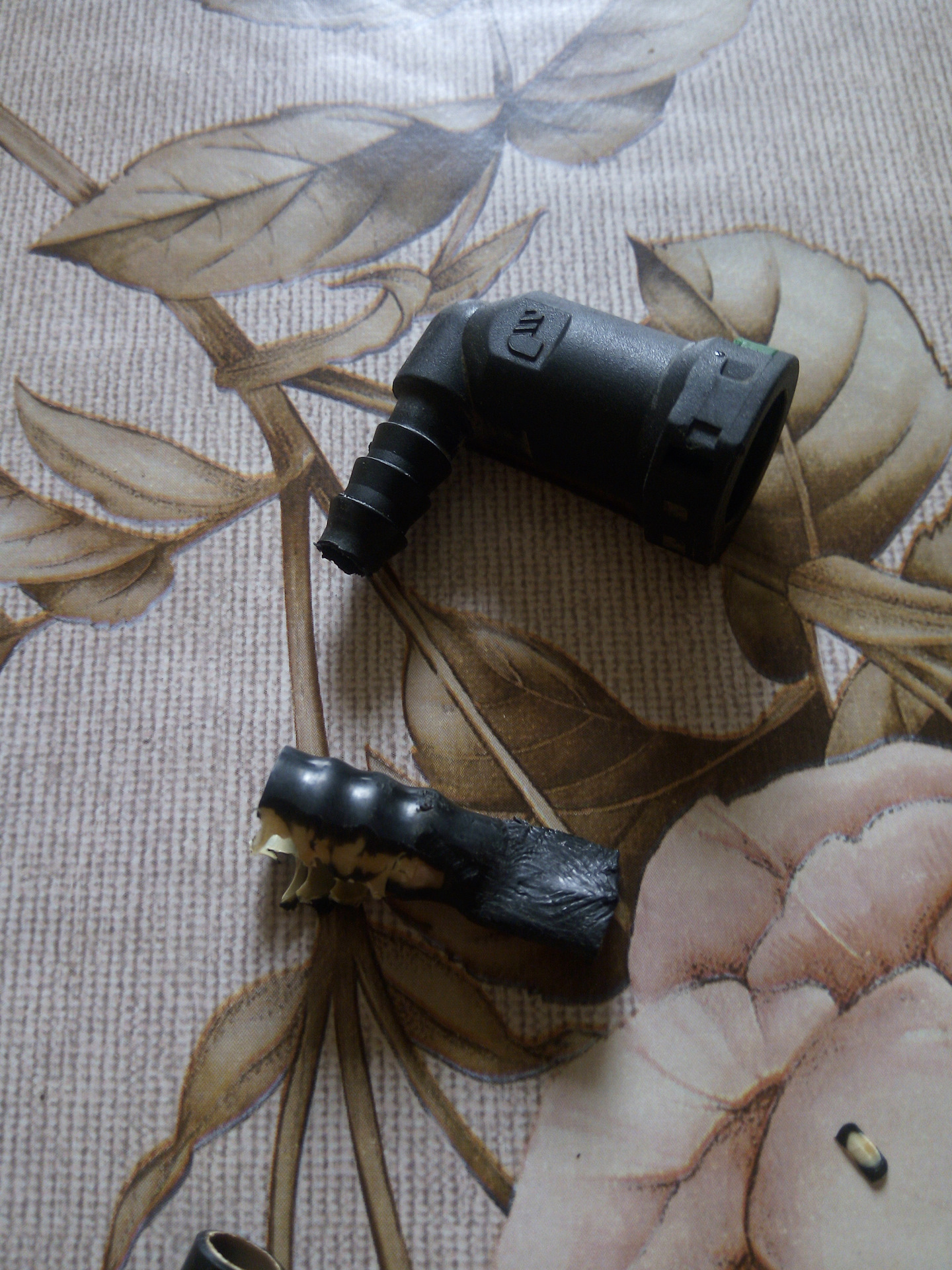 С запозданием поведаю свою историю. Поехал как-то поменять масла-фильтра на СТО, специализирующейся на ремонте французов. Подняли машину, ну все как обычно. Я стою рядом и наблюдаю. Пришла очередь замены топливного фильтра. Рукожопый, как я потом понял, берет специальные клещи для снятия быстросъемных штуцеров, что мне уже понравилось, а дальше засовывает рожковый ключ между штуцером и фильтром, слегка придавил ключиком и все, фильтр свободен. Ух, ты, подумал я, как у него это ловко получилось, далее установил новый фильтр, защелкнул новый фильтр и говыорит заведи машину, а она на подъемнике. Опустили, я залез, завожу, снизу крики этого идиота, слетает штуцер, под давлением 3,5 Бар из трубки хлещет бензин, я на подъемнике под потолком бокса, дверь близко к стойке этого самого подъемника. В случае вспышки топлива, покинуть машину быстро не получилось бы. Обошлось. Выяснилось, что, когда он ключиком отодвигал штуцера, в них слизались острые кромки фиксаторов и они перестали цепляться за поясок на фильтре. Со словами, это болезнь всех машин, этот идиот на каждом штуцере затянул по пластиковому хомуту и третьим стянул их между собой. Хорошо, что я при этом присутствовал, иначе мне потом сказали, что так и было. Впрочем, материальной компенсации все-равно я не получил. Но нажил себе головной боли, как теперь устранить это скотство, а впереди было жаркое лето и не хотелось где-нибудь, стоя в пробке загореться. Начал искать варианты, искать новые трубки от донора не вариант, слишком хлопотно перекладывать, не везде свободный доступ. В интернете нашел очень похожие от Нивы-Шеви. Бывают прямые и угловые . Купил пару и стал думать, как же их поставить вместо поврежденных. Тоже думал греть, но чужой опыт говорил, что нифига не выйдет . И, вот, в какой-то момент, подумал, а, может у них ливер одинаковый ? Разобрал свой и донорский и, о чудо, внутренности удар-в-удар . Перебрал оба штуцера за 15 минут лежа на картонке у слегка поддомкраченной машины . Извините, за много букв, но буду рад, если мой опыт пригодится кому-нибудь.